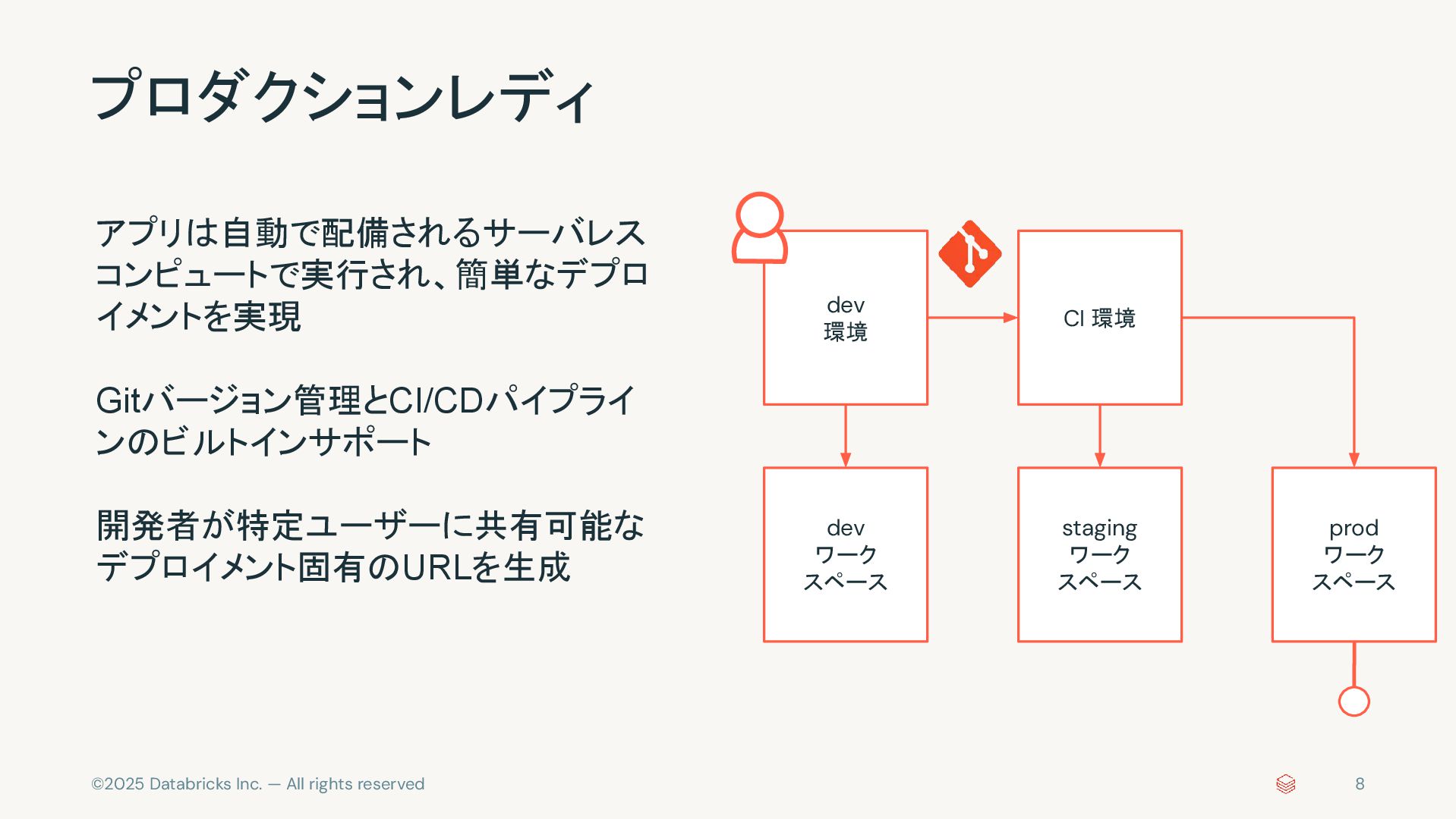 ©2025 Databricks Inc. — All rights reserved アプリは自動で配備されるサーバレス コンピュートで実行され、簡単なデプロ イメントを実現