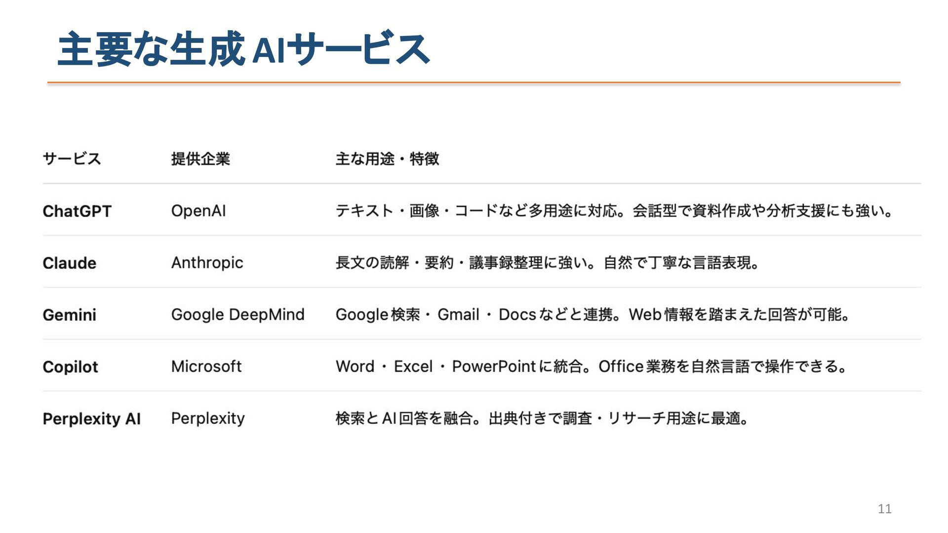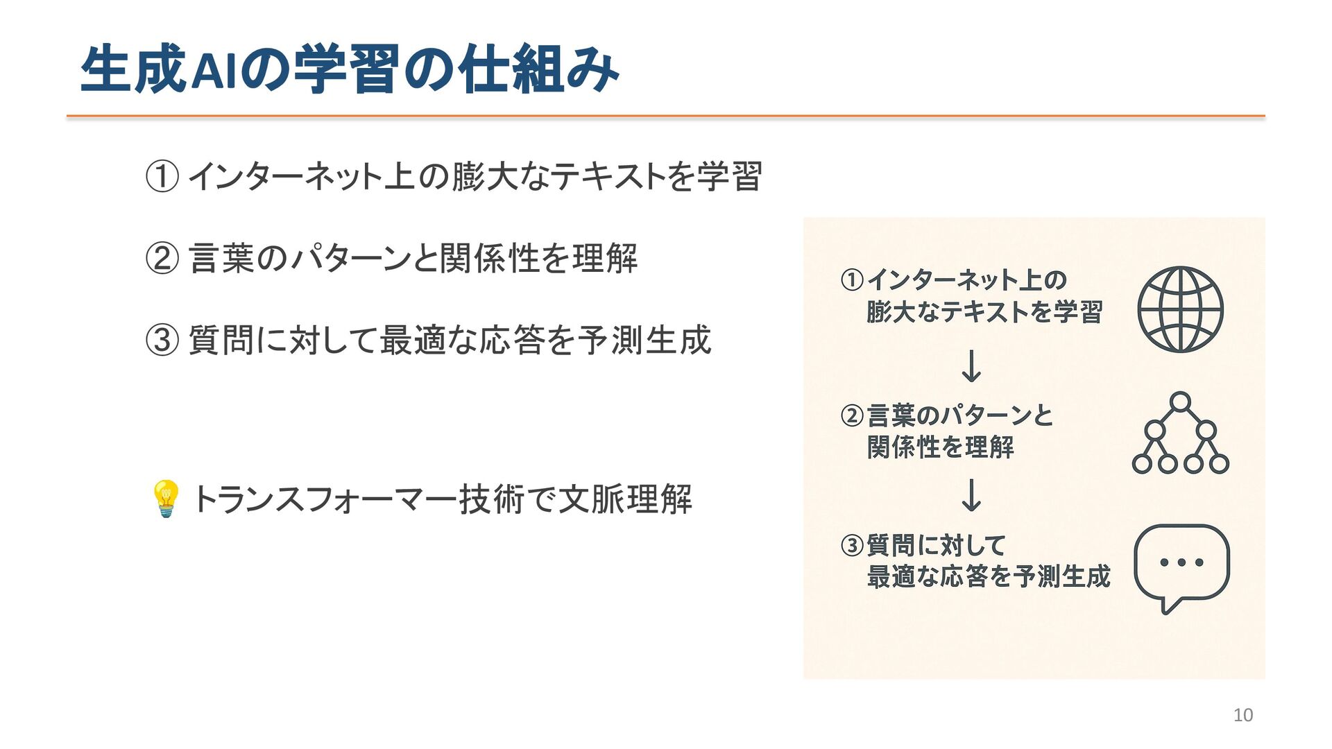 生成AIの学習の仕組み ① インターネット上の膨大なテキストを学習 ② 言葉のパターンと関係性を理解 ③ 質問に対して最適な応答を予測生成 💡 トランスフォーマー技術で文脈理解 10