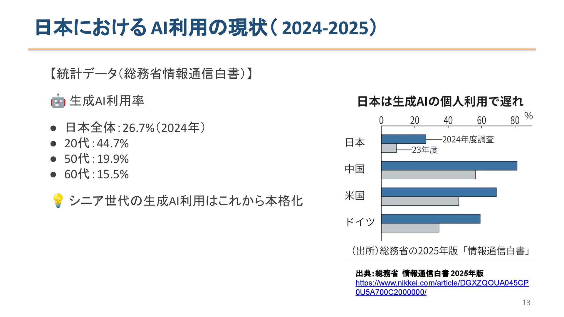 日本における AI利用の現状( 2024-2025) 【統計データ(総務省情報通信白書)】 🤖 生成AI利用率 • 日本全体:26.7%(2024年) • 20代:44.7%