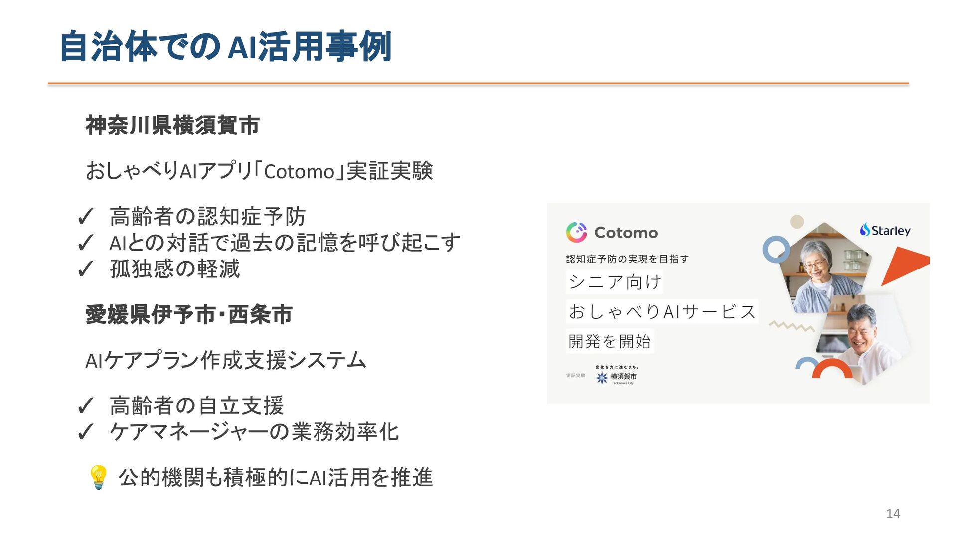 自治体での AI活用事例 神奈川県横須賀市 おしゃべりAIアプリ「Cotomo」実証実験 ✓ 高齢者の認知症予防 ✓ AIとの対話で過去の記憶を呼び起こす ✓ 孤独感の軽減