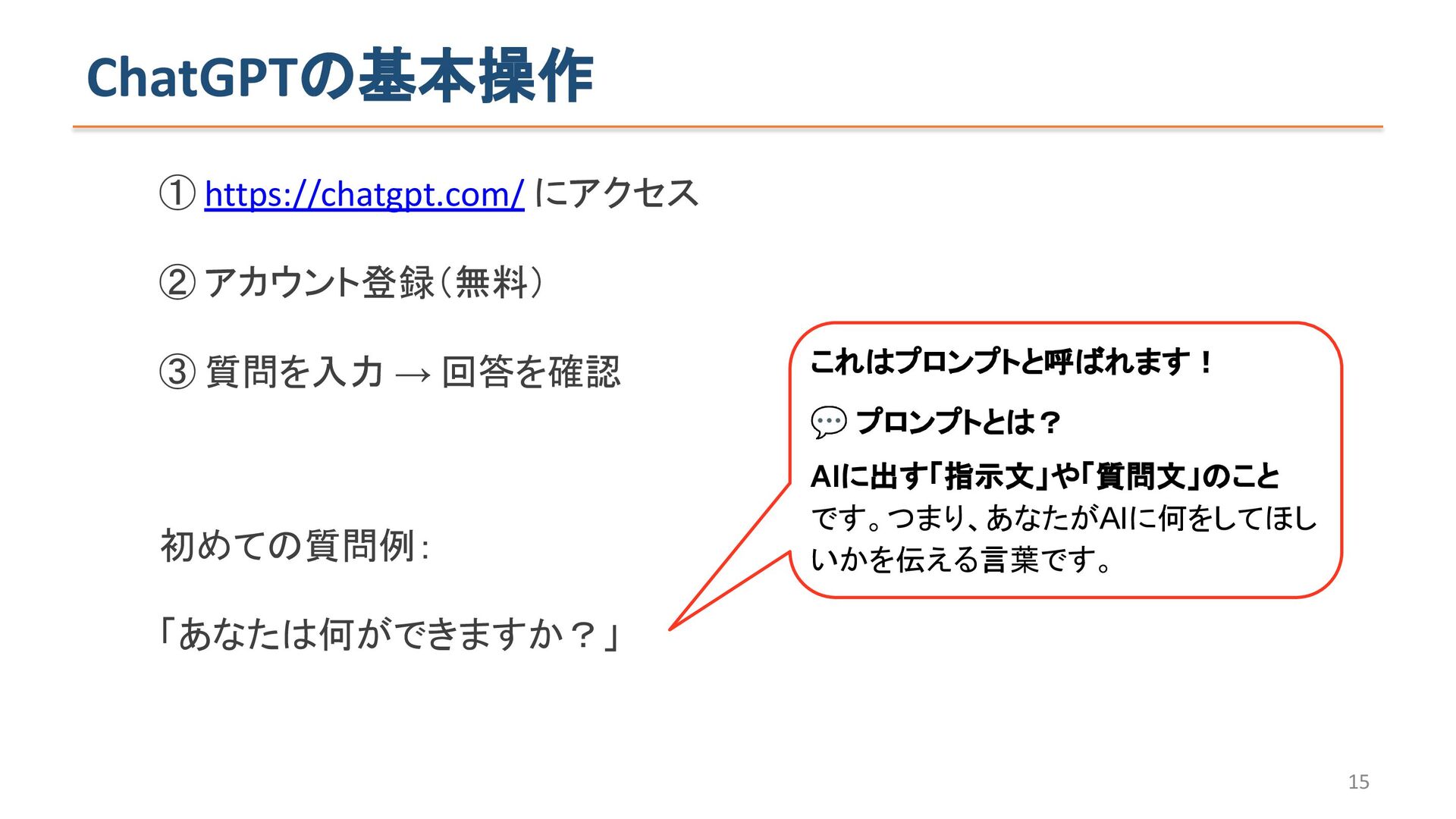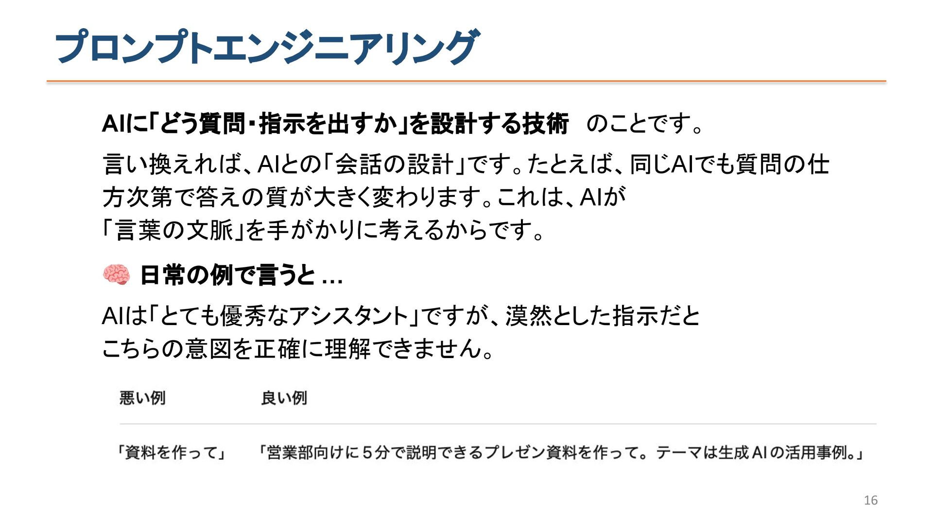初めての質問例: 「あなたは何ができますか?」 15 これはプロンプトと呼ばれます! 💬 プロンプトとは? AIに出す「指示文」や「質問文」のこと です。つまり、あなたがAIに何をしてほし いかを伝える言葉です。