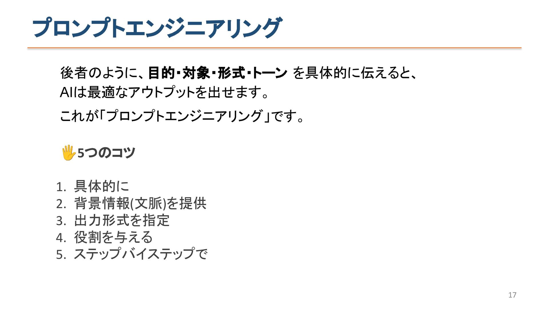 プロンプトエンジニアリング 後者のように、目的・対象・形式・トーン を具体的に伝えると、 AIは最適なアウトプットを出せます。 これが「プロンプトエンジニアリング」です。 🖐5つのコツ 1. 具体的に 2. 背景情報(文脈)を提供
