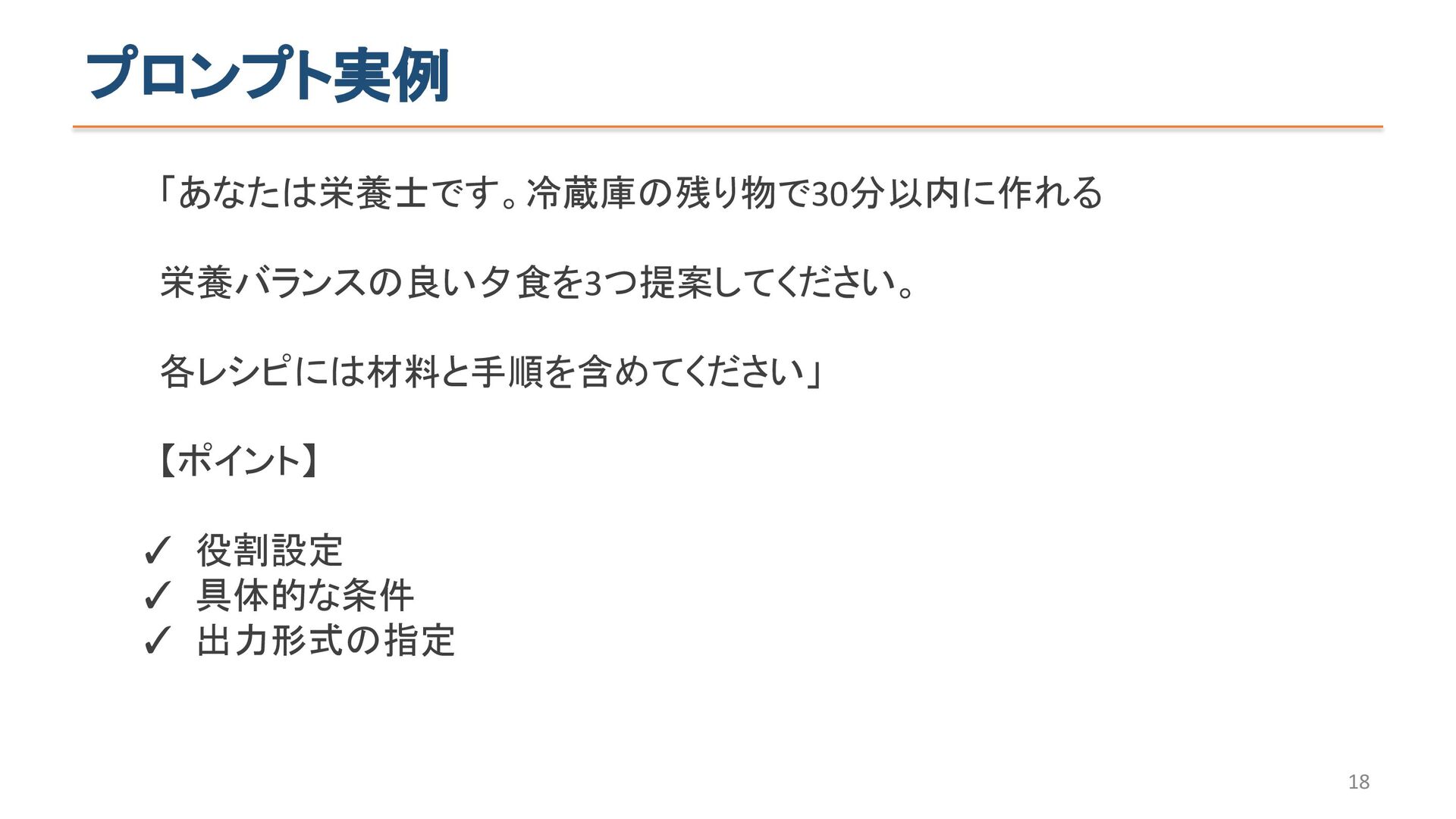 プロンプト実例 「あなたは栄養士です。冷蔵庫の残り物で30分以内に作れる 栄養バランスの良い夕食を3つ提案してください。 各レシピには材料と手順を含めてください」 【ポイント】 ✓ 役割設定 ✓ 具体的な条件 ✓