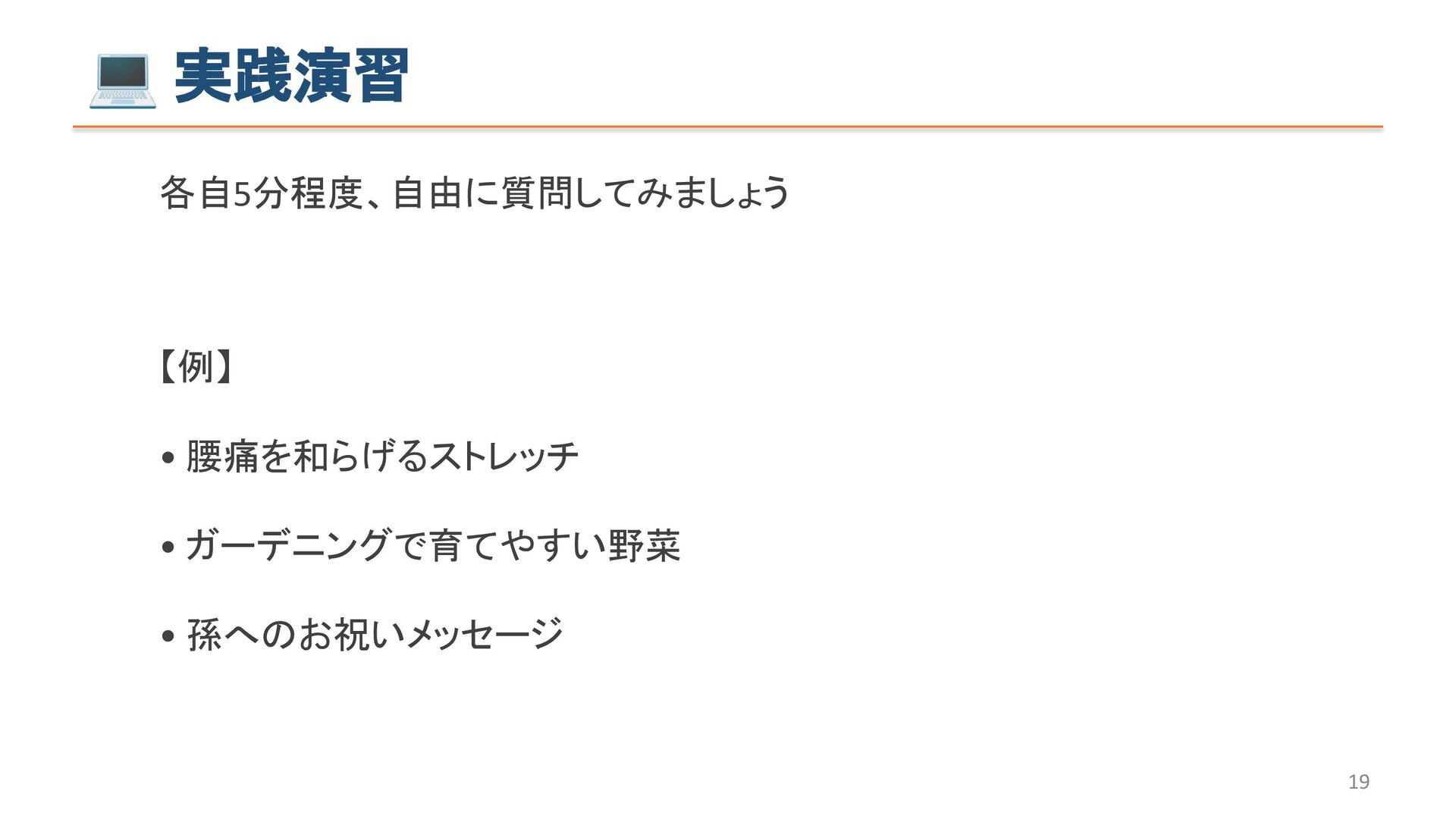 💻 実践演習 各自5分程度、自由に質問してみましょう 【例】 • 腰痛を和らげるストレッチ • ガーデニングで育てやすい野菜 • 孫へのお祝いメッセージ