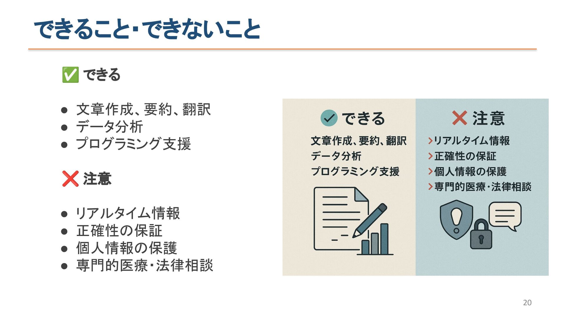できること・できないこと ✅ できる • 文章作成、要約、翻訳 • データ分析 • プログラミング支援 ❌
