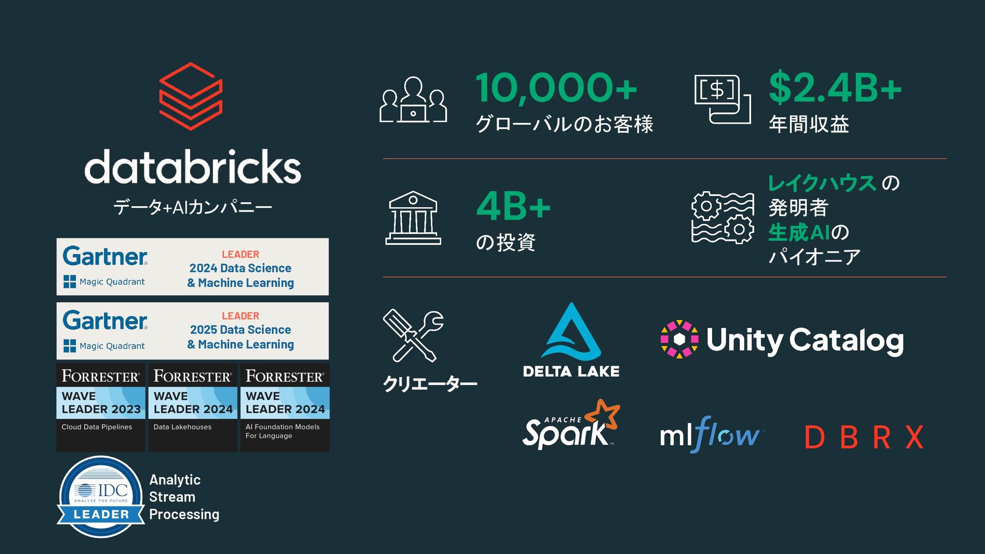 グローバルのお客様 $2.4B+ 年間収益 4B+ の投資 レイクハウス の 発明者 生成AIの パイオニア LEADER 2025 Data Science & Machine Learning Analytic Stream Processing LEADER 2024 Data Science & Machine Learning