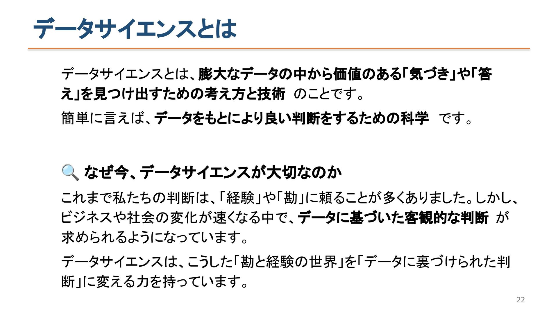 が 求められるようになっています。 データサイエンスは、こうした「勘と経験の世界」を「データに裏づけられた判 断」に変える力を持っています。 22