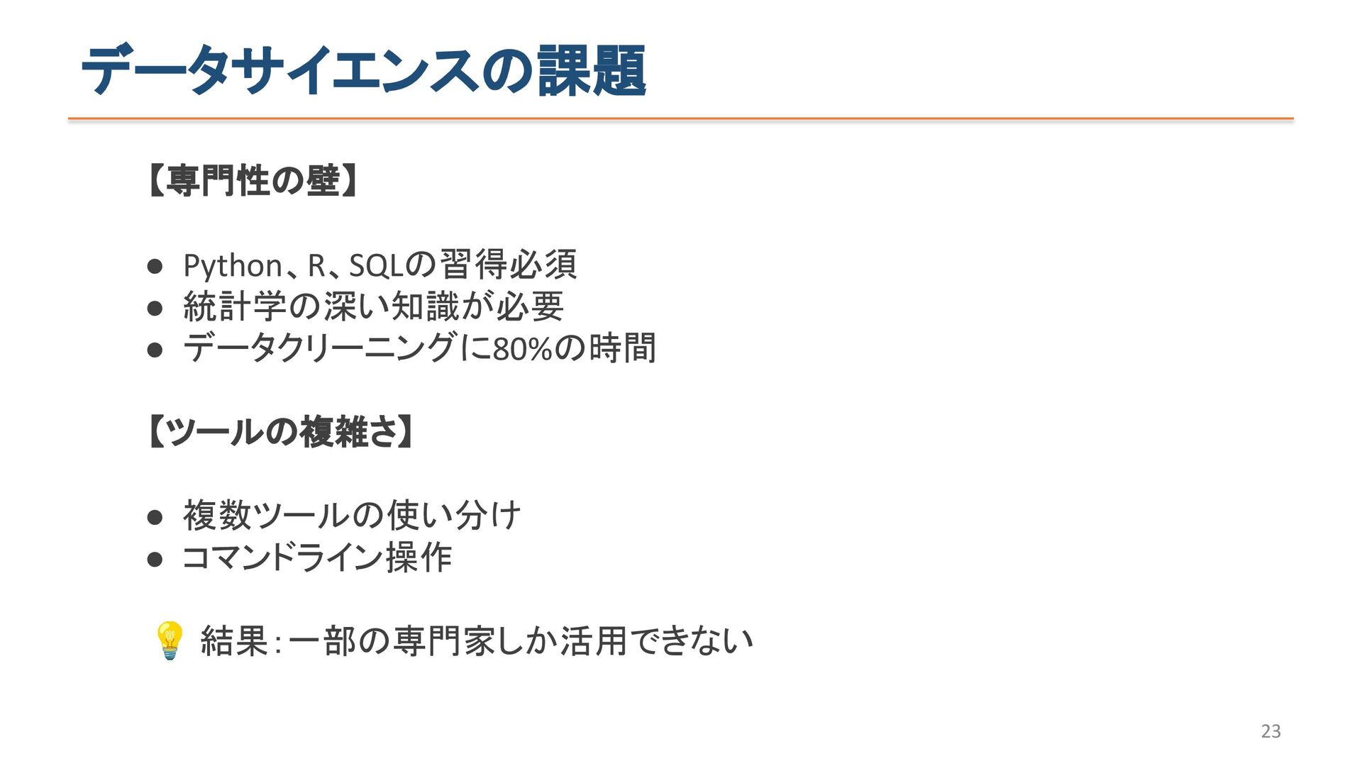 データサイエンスの課題 【専門性の壁】 • Python、R、SQLの習得必須 • 統計学の深い知識が必要 • データクリーニングに80%の時間 【ツールの複雑さ】 •