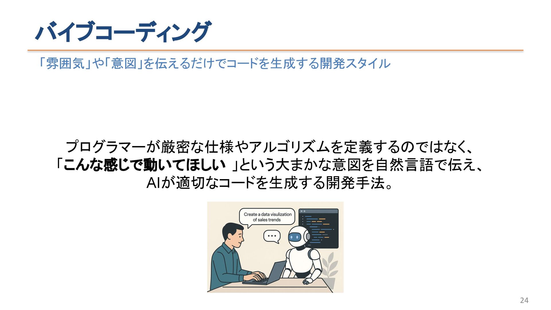 バイブコーディング 「雰囲気」や「意図」を伝えるだけでコードを生成する開発スタイル プログラマーが厳密な仕様やアルゴリズムを定義するのではなく、 「こんな感じで動いてほしい 」という大まかな意図を自然言語で伝え、 AIが適切なコードを生成する開発手法。 24