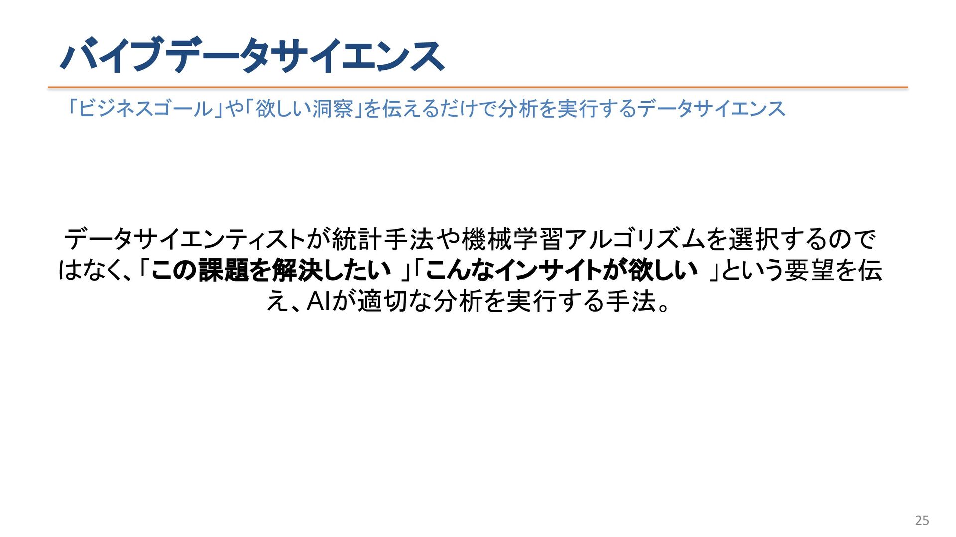 バイブデータサイエンス 「ビジネスゴール」や「欲しい洞察」を伝えるだけで分析を実行するデータサイエンス データサイエンティストが統計手法や機械学習アルゴリズムを選択するので はなく、「この課題を解決したい 」「こんなインサイトが欲しい 」という要望を伝 え、AIが適切な分析を実行する手法。 25