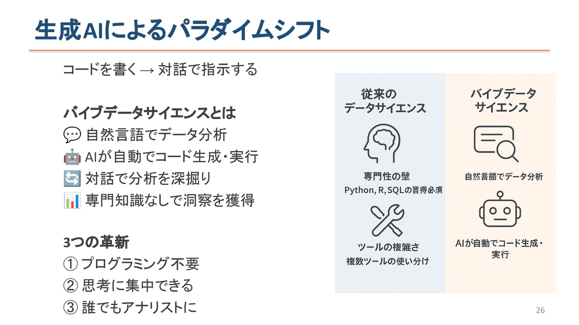 生成AIによるパラダイムシフト コードを書く → 対話で指示する バイブデータサイエンスとは 💬 自然言語でデータ分析 🤖 AIが自動でコード生成・実行 🔄