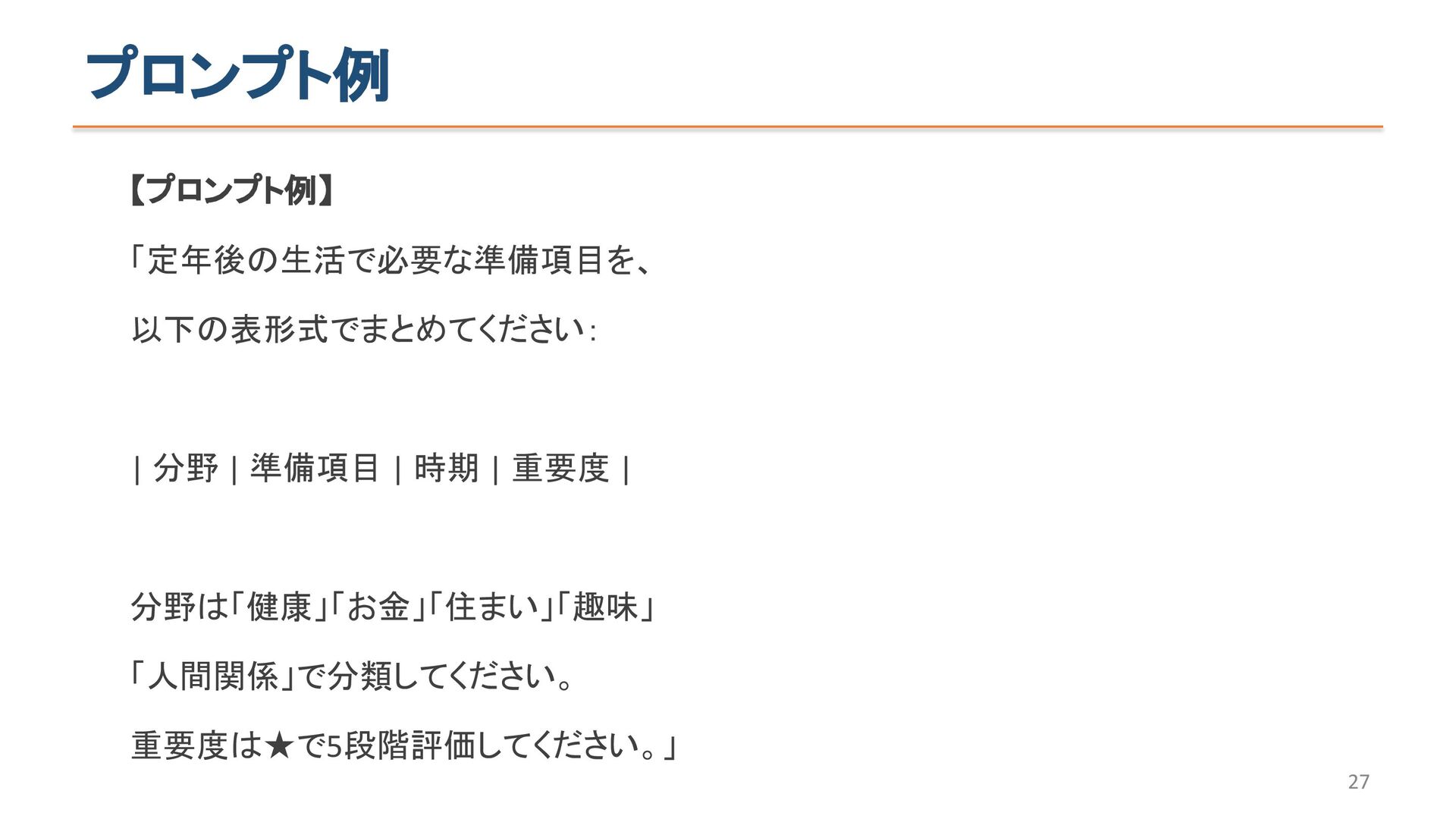 プロンプト例 【プロンプト例】 「定年後の生活で必要な準備項目を、 以下の表形式でまとめてください: | 分野 | 準備項目 | 時期