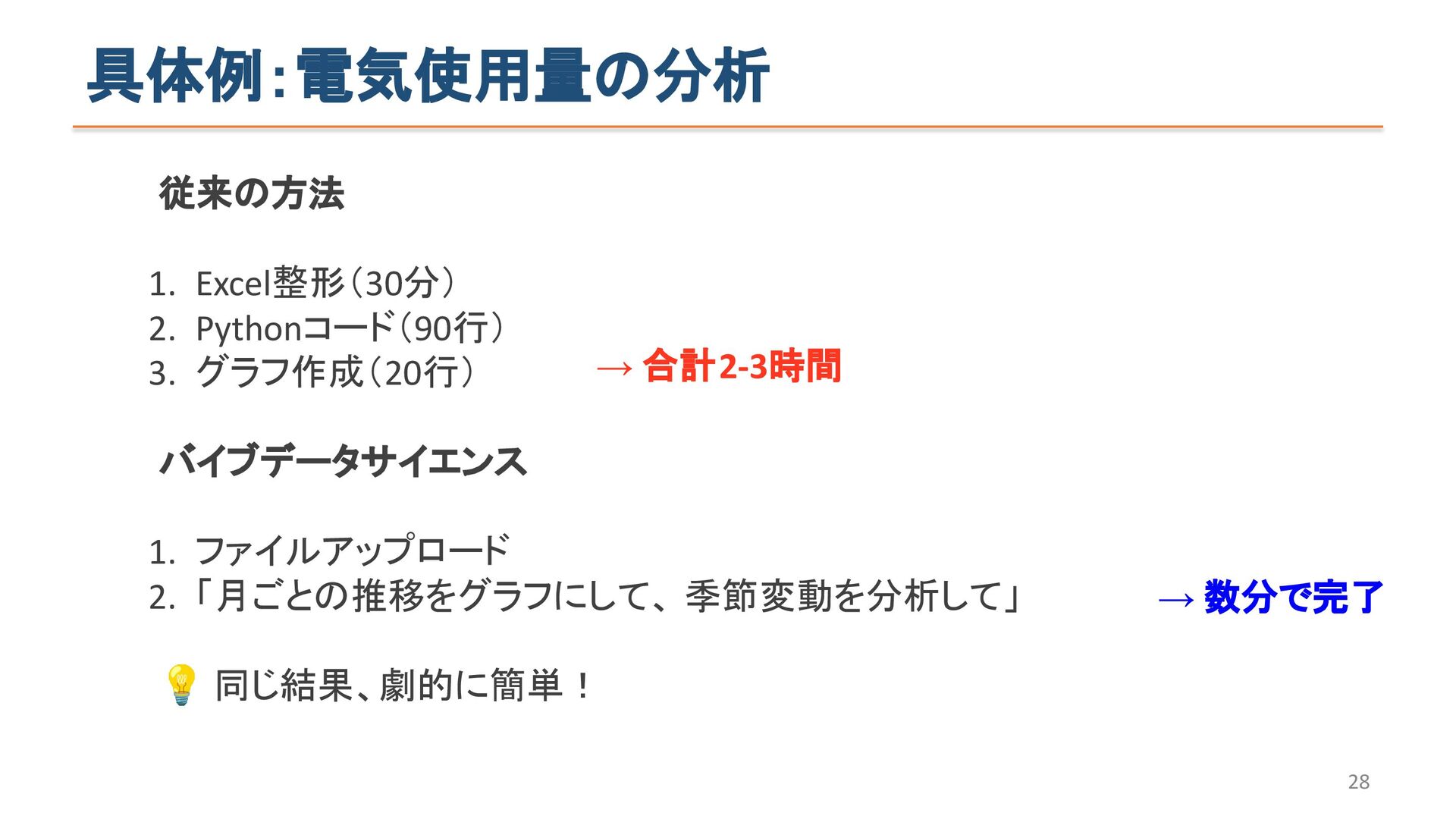 具体例:電気使用量の分析 従来の方法 1. Excel整形(30分) 2. Pythonコード(90行) 3. グラフ作成(20行) バイブデータサイエンス 1.