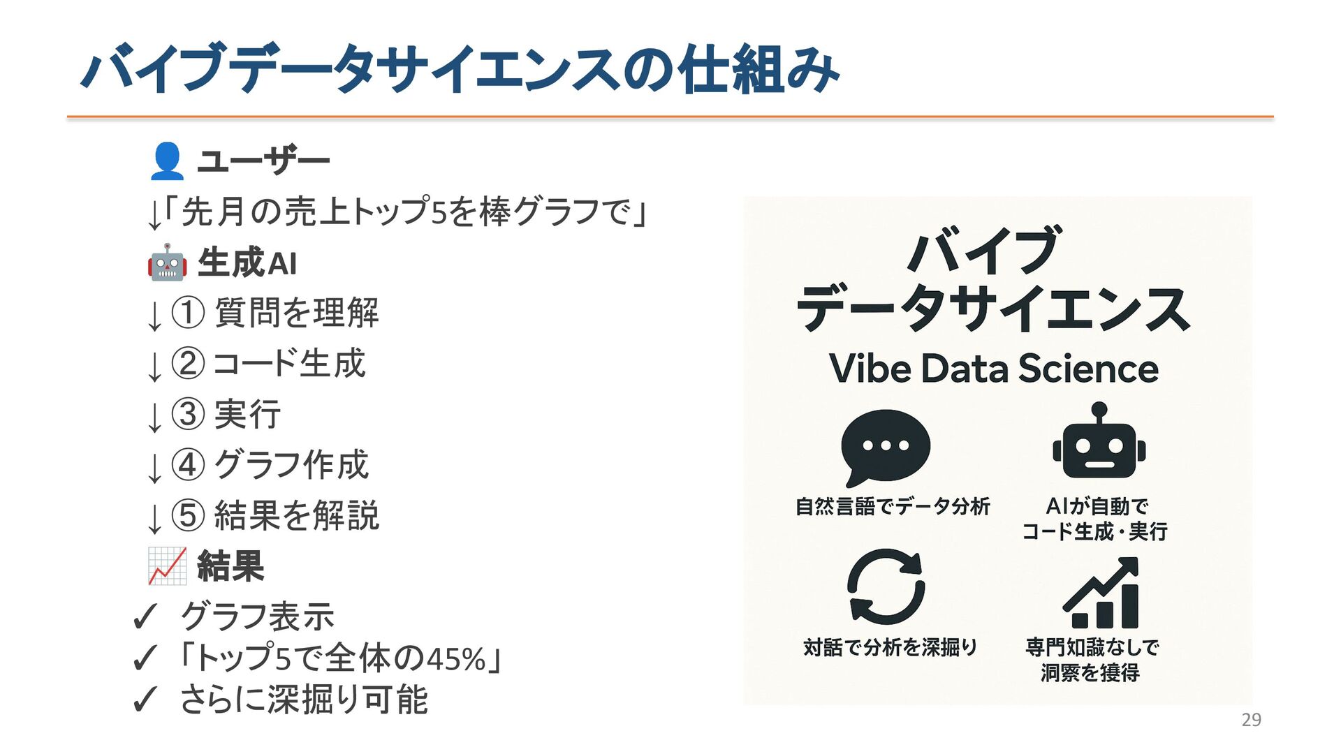 バイブデータサイエンスの仕組み 👤 ユーザー ↓「先月の売上トップ5を棒グラフで」 🤖 生成AI ↓ ① 質問を理解 ↓