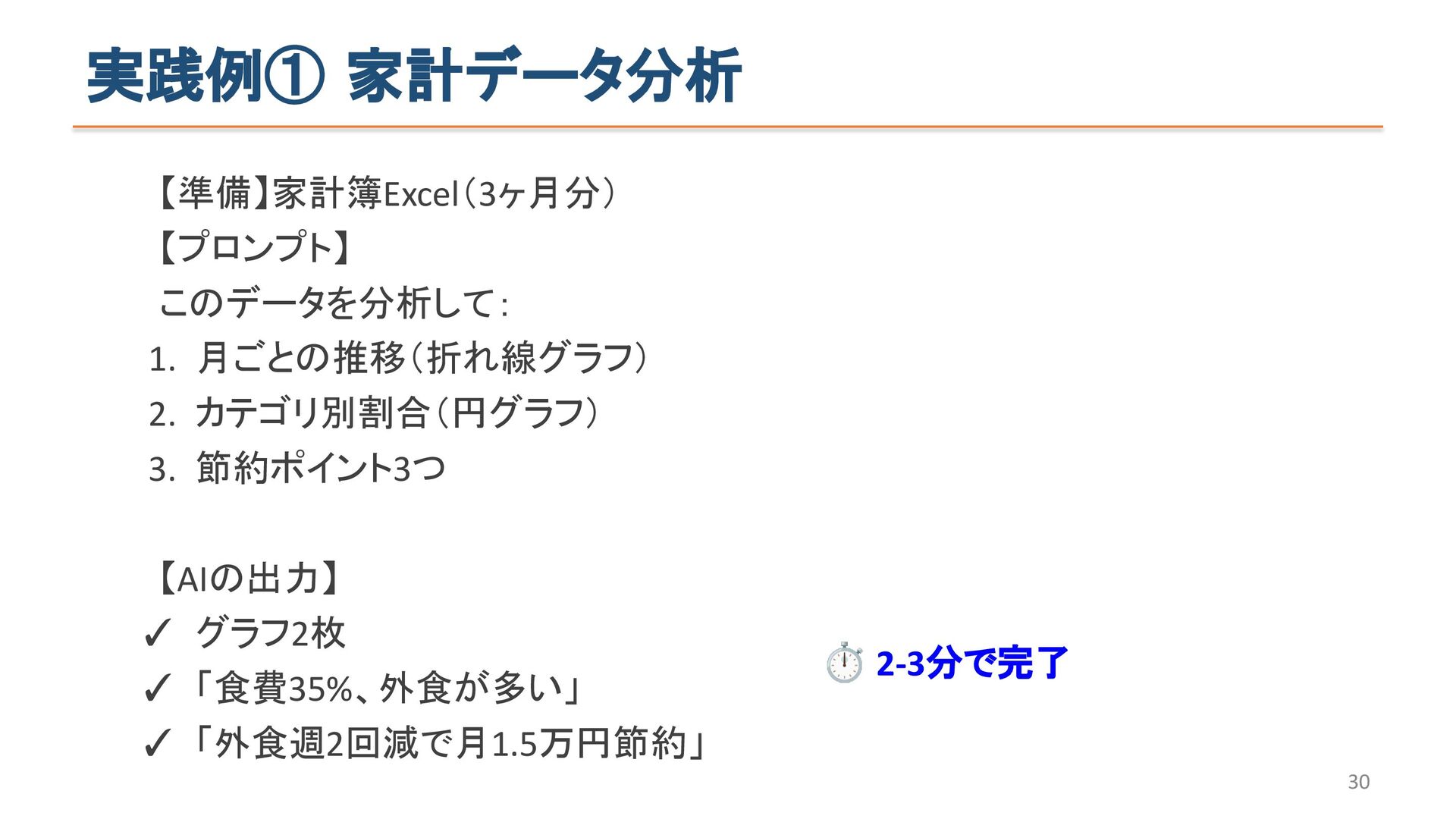 節約ポイント3つ 【AIの出力】 ✓ グラフ2枚 ✓ 「食費35%、外食が多い」 ✓ 「外食週2回減で月1.5万円節約」 30 ⏱ 2-3分で完了