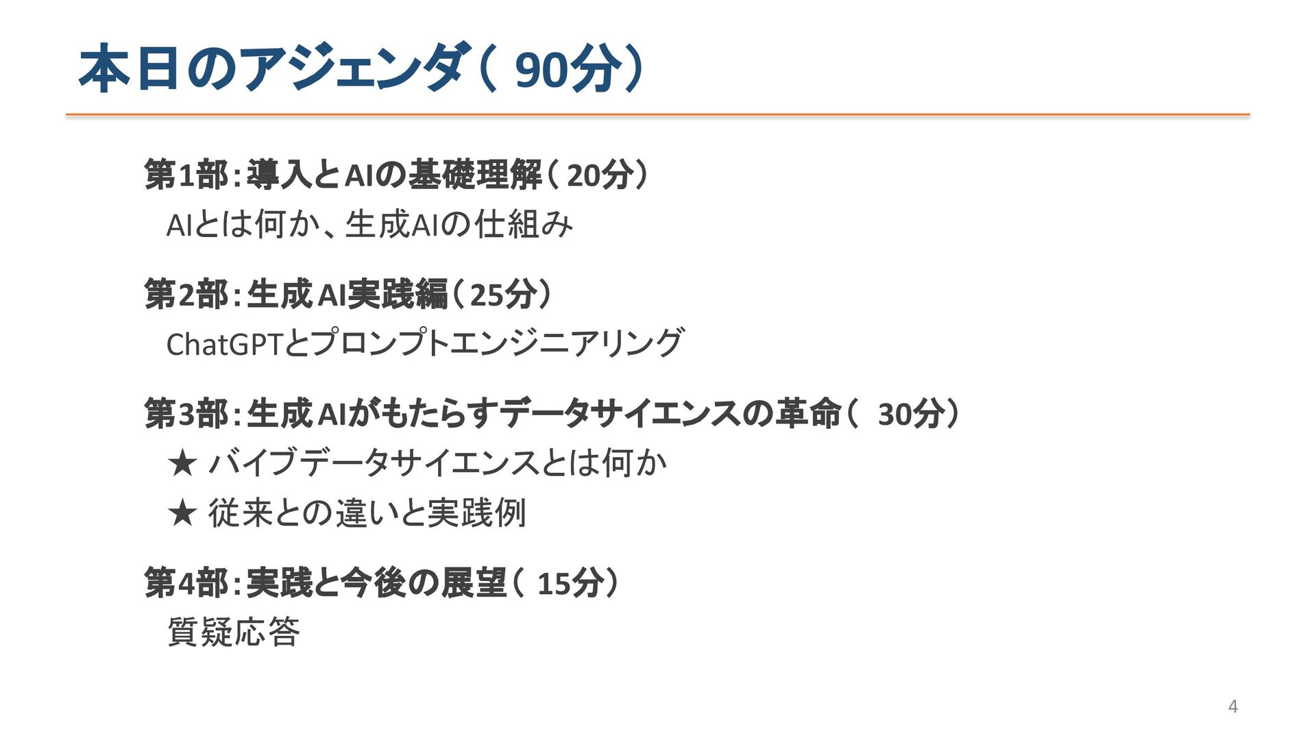 本日のアジェンダ( 90分) 第1部:導入と AIの基礎理解( 20分) AIとは何か、生成AIの仕組み 第2部:生成AI実践編(25分) ChatGPTとプロンプトエンジニアリング 第3部:生成AIがもたらすデータサイエンスの革命( 30分)