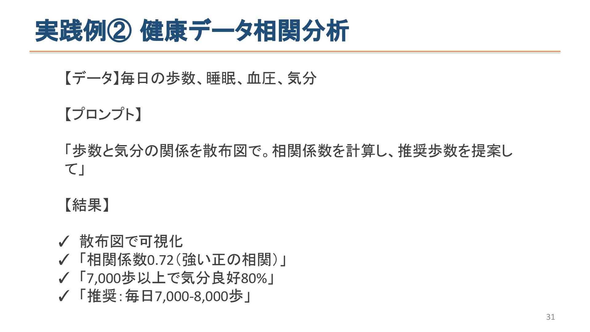 実践例② 健康データ相関分析 【データ】毎日の歩数、睡眠、血圧、気分 【プロンプト】 「歩数と気分の関係を散布図で。相関係数を計算し、推奨歩数を提案し て」 【結果】 ✓ 散布図で可視化 ✓