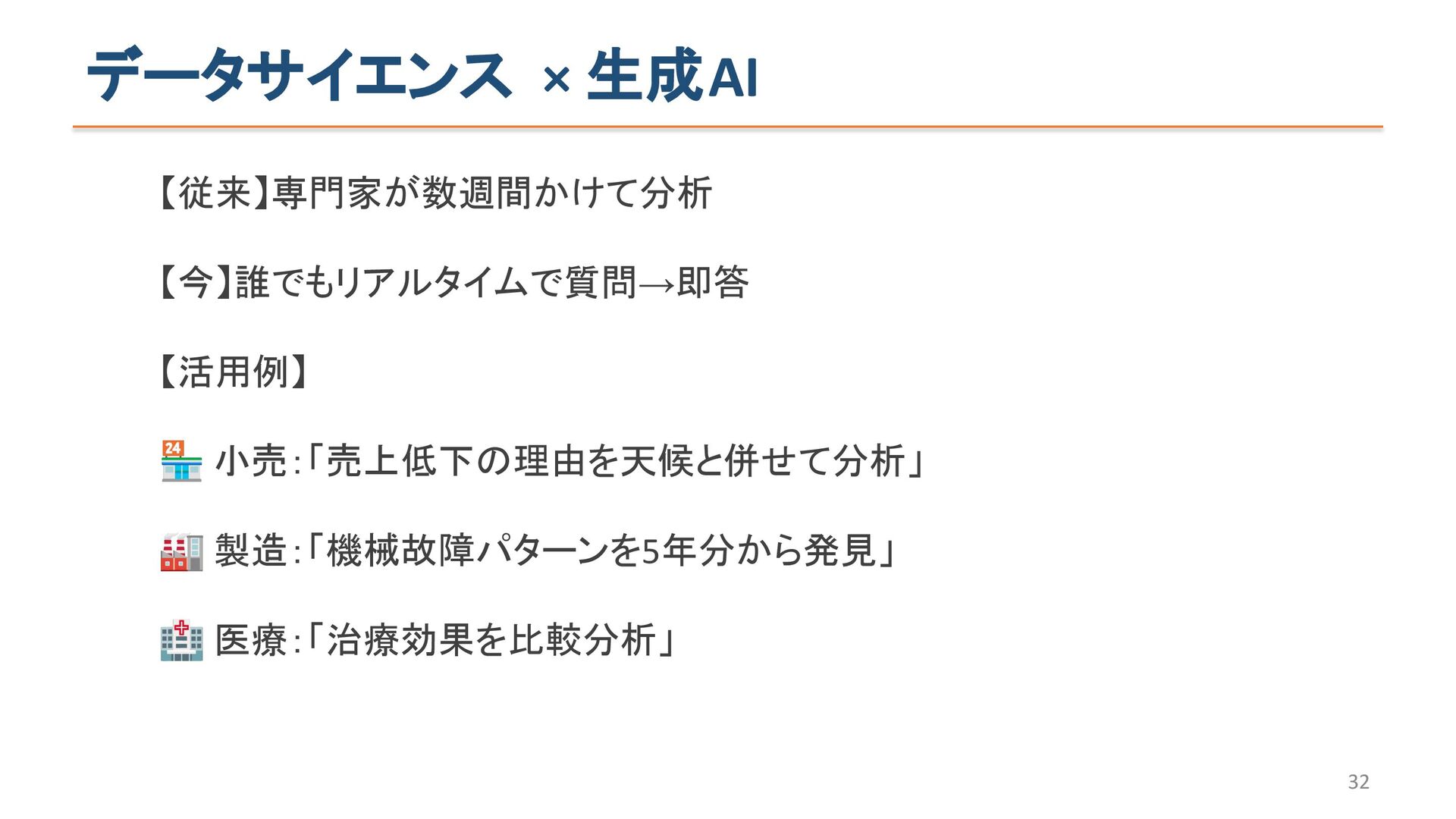 データサイエンス × 生成AI 【従来】専門家が数週間かけて分析 【今】誰でもリアルタイムで質問→即答 【活用例】 🏪 小売:「売上低下の理由を天候と併せて分析」 🏭 製造:「機械故障パターンを5年分から発見」