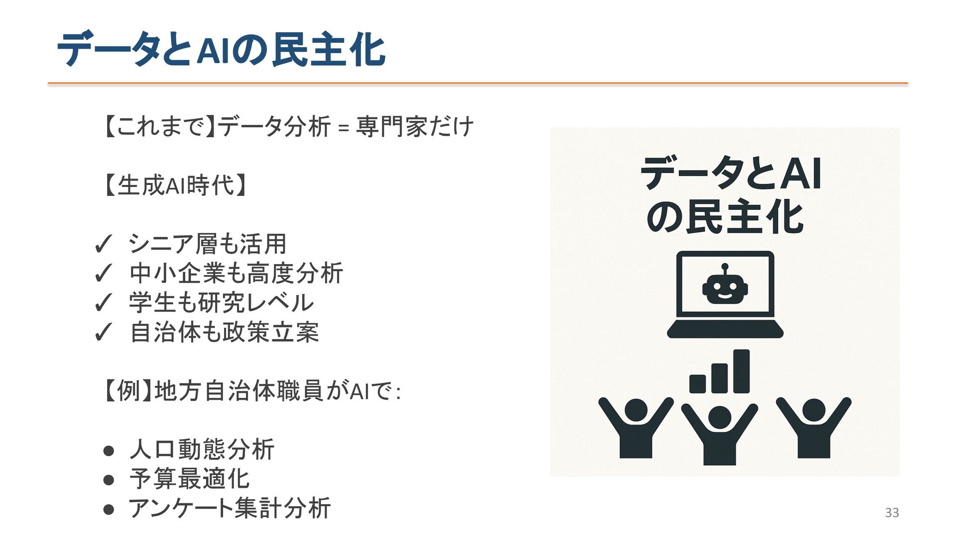 データとAIの民主化 【これまで】データ分析 = 専門家だけ 【生成AI時代】 ✓ シニア層も活用 ✓ 中小企業も高度分析 ✓