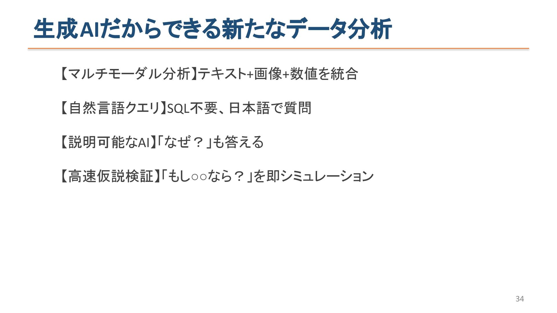 生成AIだからできる新たなデータ分析 【マルチモーダル分析】テキスト+画像+数値を統合 【自然言語クエリ】SQL不要、日本語で質問 【説明可能なAI】「なぜ?」も答える 【高速仮説検証】「もし◦◦なら?」を即シミュレーション 34