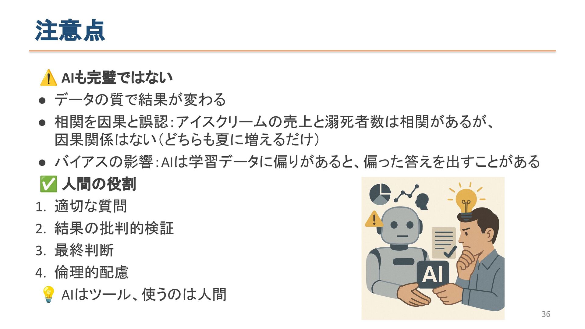 注意点 ⚠ AIも完璧ではない • データの質で結果が変わる • 相関を因果と誤認:アイスクリームの売上と溺死者数は相関があるが、 因果関係はない(どちらも夏に増えるだけ) • バイアスの影響:AIは学習データに偏りがあると、偏った答えを出すことがある