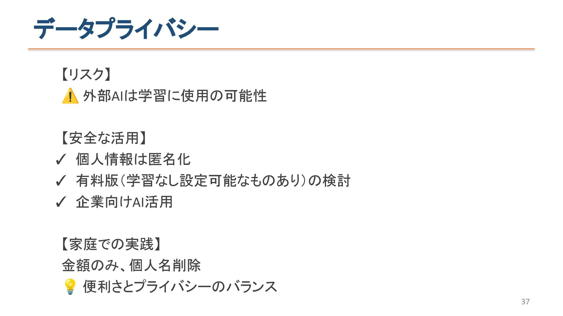 企業向けAI活用 【家庭での実践】 金額のみ、個人名削除 💡 便利さとプライバシーのバランス 37