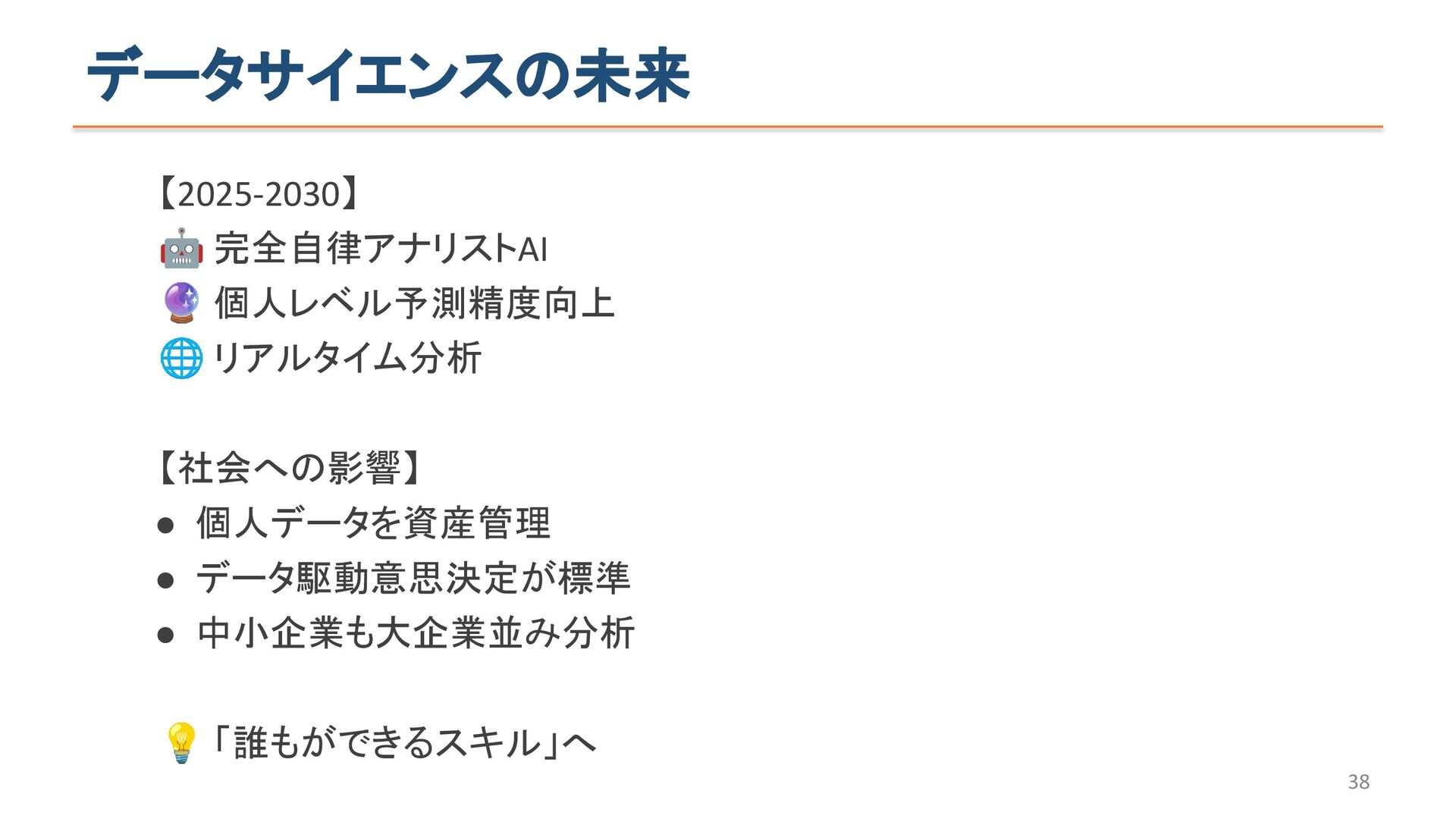 個人データを資産管理 • データ駆動意思決定が標準 • 中小企業も大企業並み分析 💡 「誰もができるスキル」へ 38