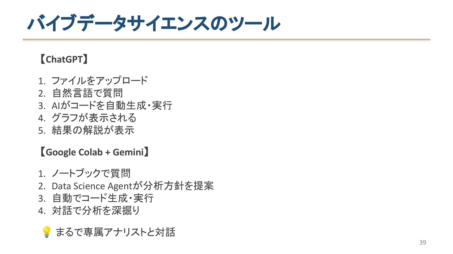 5. 結果の解説が表示 【Google Colab + Gemini】 1. ノートブックで質問 2. Data Science Agentが分析方針を提案 3. 自動でコード生成・実行 4. 対話で分析を深掘り 💡 まるで専属アナリストと対話 39