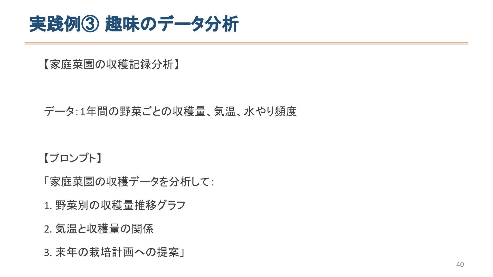 実践例③ 趣味のデータ分析 【家庭菜園の収穫記録分析】 データ:1年間の野菜ごとの収穫量、気温、水やり頻度 【プロンプト】 「家庭菜園の収穫データを分析して: 1. 野菜別の収穫量推移グラフ 2. 気温と収穫量の関係
