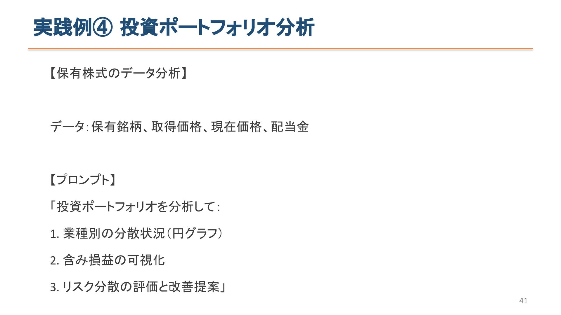 実践例④ 投資ポートフォリオ分析 【保有株式のデータ分析】 データ:保有銘柄、取得価格、現在価格、配当金 【プロンプト】 「投資ポートフォリオを分析して: 1. 業種別の分散状況(円グラフ) 2. 含み損益の可視化