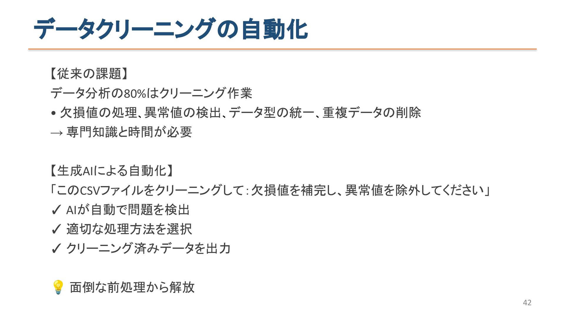 データクリーニングの自動化 【従来の課題】 データ分析の80%はクリーニング作業 • 欠損値の処理、異常値の検出、データ型の統一、重複データの削除 → 専門知識と時間が必要 【生成AIによる自動化】 「このCSVファイルをクリーニングして:欠損値を補完し、異常値を除外してください」 ✓