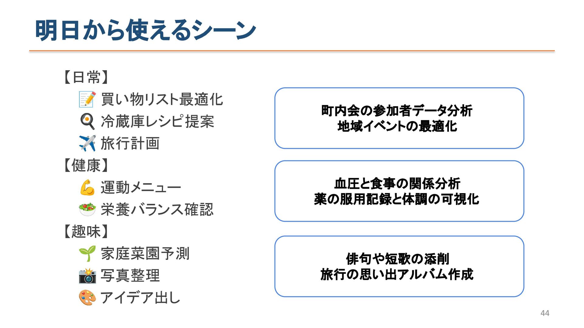 明日から使えるシーン 【日常】 📝 買い物リスト最適化 🍳 冷蔵庫レシピ提案 ✈ 旅行計画 【健康】 💪