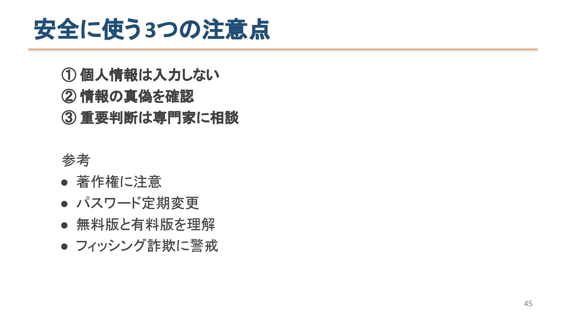 安全に使う 3つの注意点 ① 個人情報は入力しない ② 情報の真偽を確認 ③ 重要判断は専門家に相談 参考 •