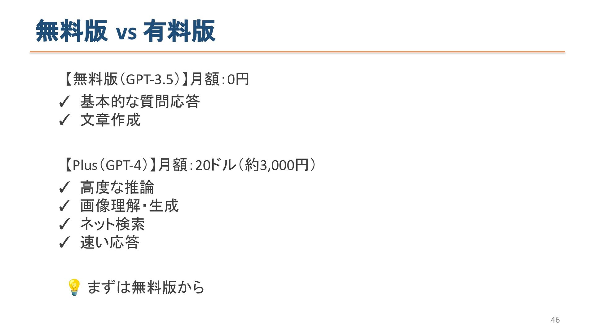 高度な推論 ✓ 画像理解・生成 ✓ ネット検索 ✓ 速い応答 💡 まずは無料版から 46