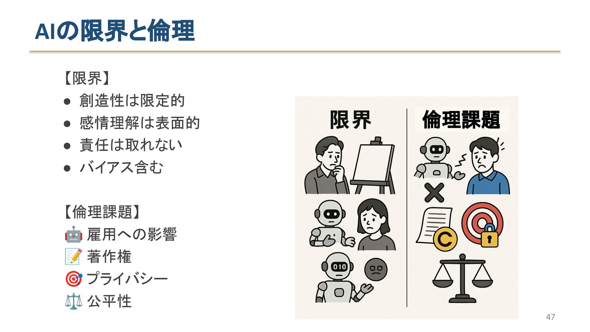 【倫理課題】 🤖 雇用への影響 📝 著作権 🎯 プライバシー ⚖ 公平性 47 倫理課題