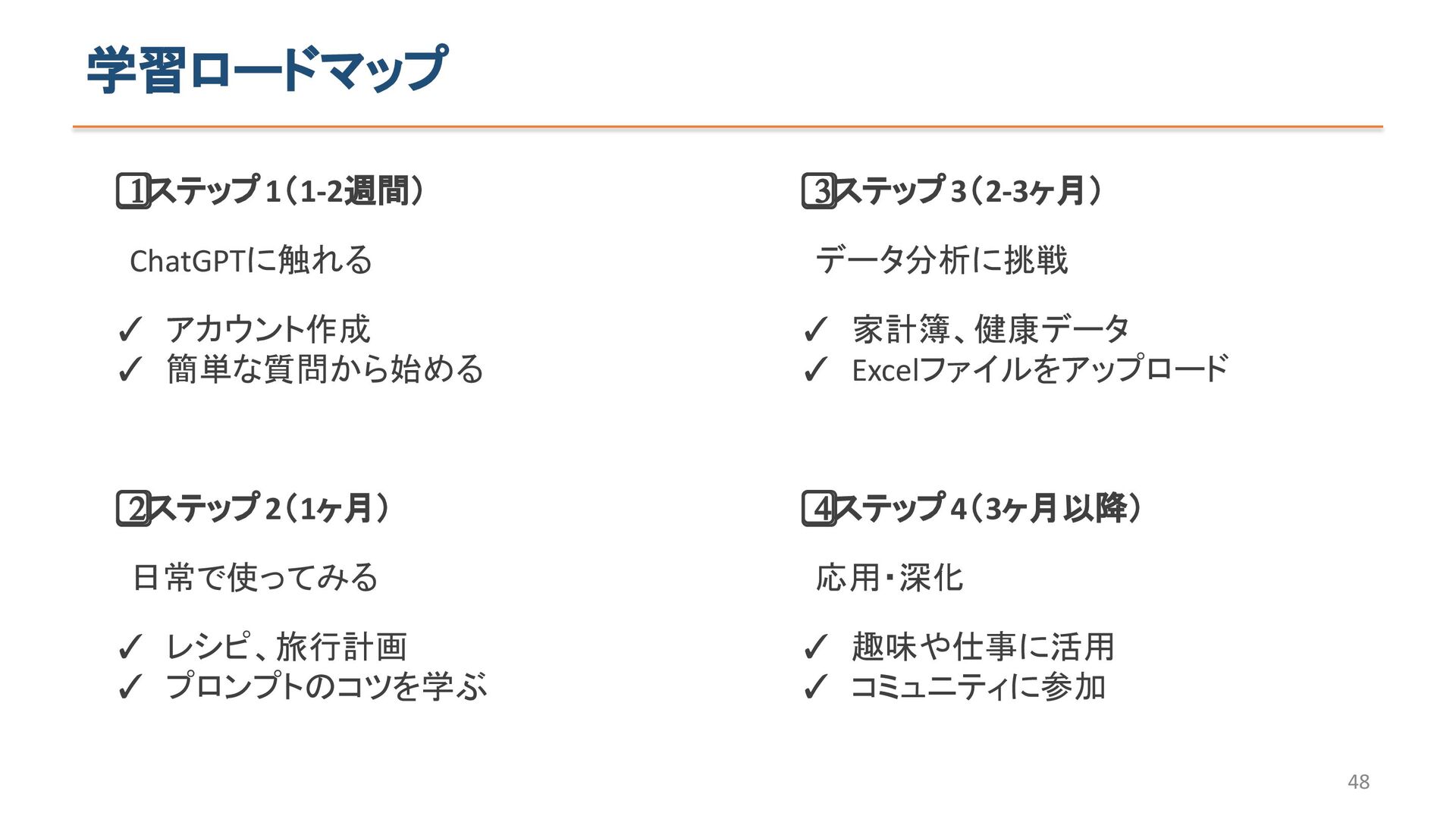 学習ロードマップ 1⃣ステップ1(1-2週間) ChatGPTに触れる ✓ アカウント作成 ✓ 簡単な質問から始める 2⃣ステップ2(1ヶ月) 日常で使ってみる ✓