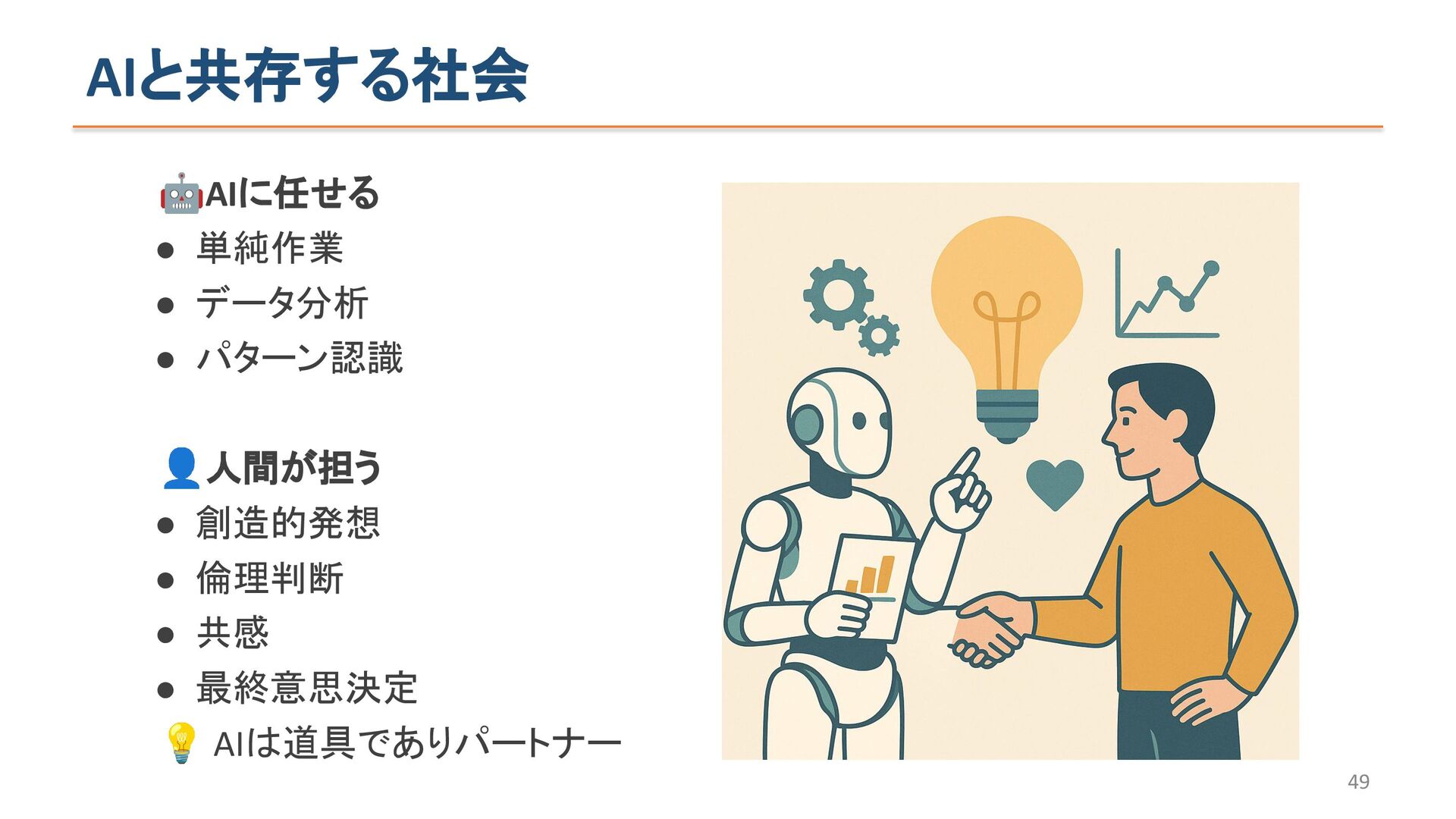 AIと共存する社会 🤖AIに任せる • 単純作業 • データ分析 • パターン認識 👤人間が担う •
