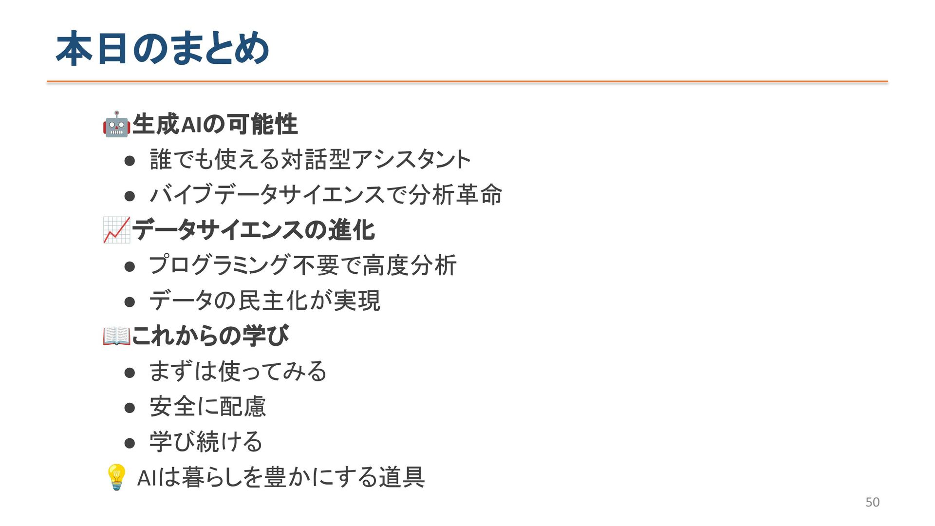 データの民主化が実現 📖これからの学び • まずは使ってみる • 安全に配慮 • 学び続ける 💡 AIは暮らしを豊かにする道具 50