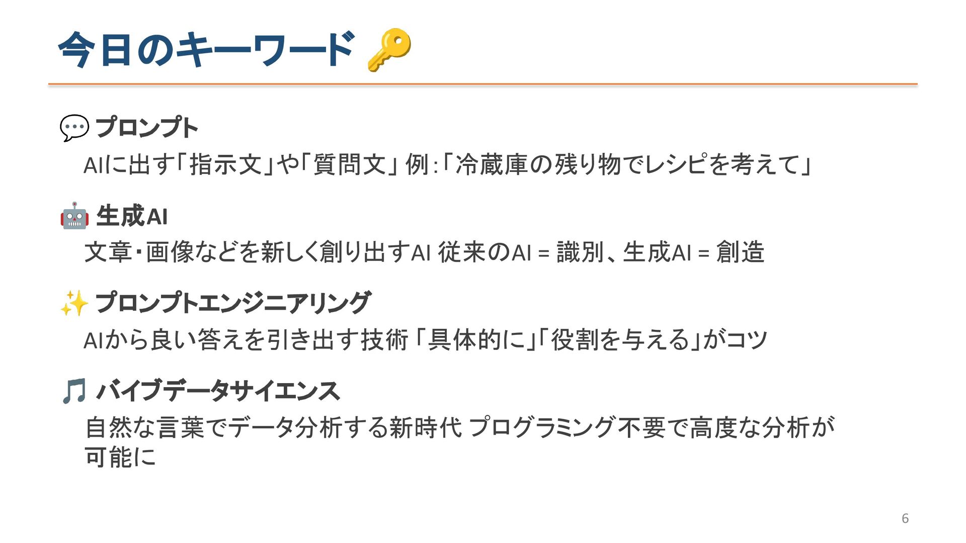 今日のキーワード 🔑 💬 プロンプト AIに出す「指示文」や「質問文」 例:「冷蔵庫の残り物でレシピを考えて」 🤖 生成AI 文章・画像などを新しく創り出すAI 従来のAI