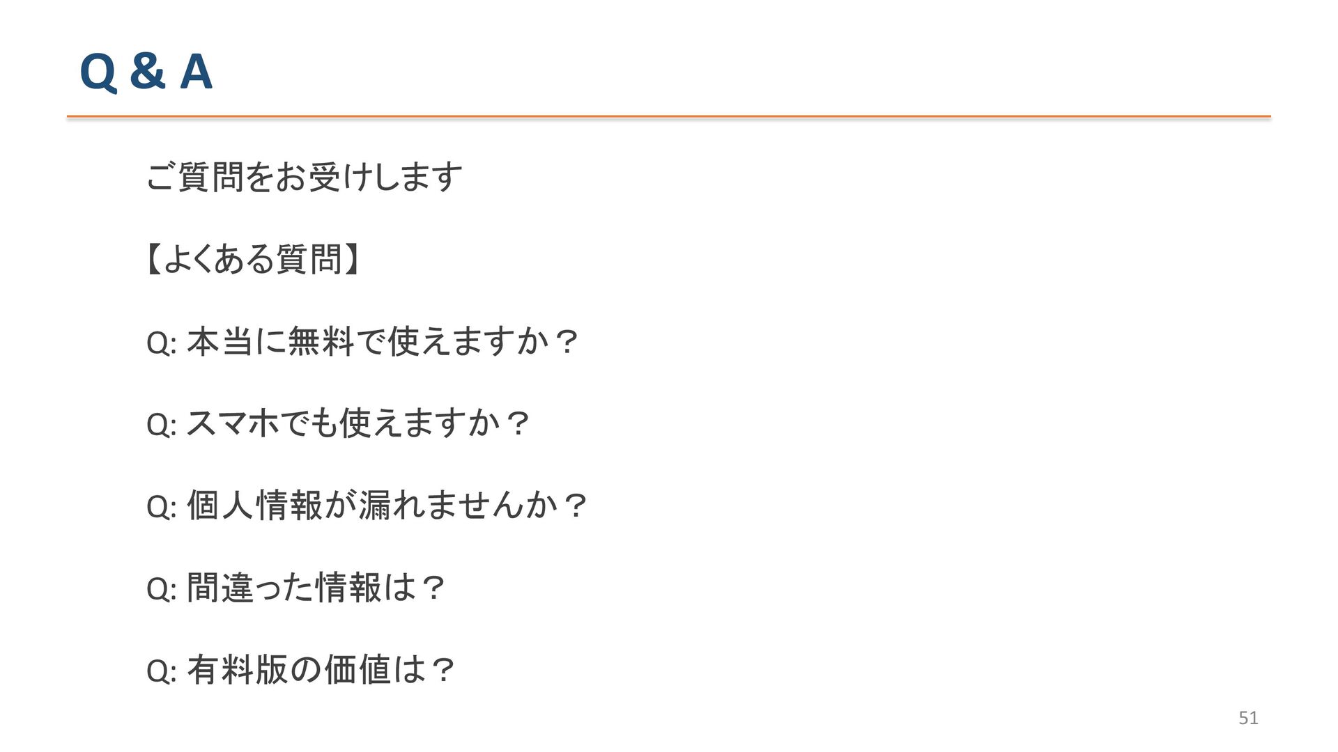 個人情報が漏れませんか? Q: 間違った情報は? Q: 有料版の価値は? 51