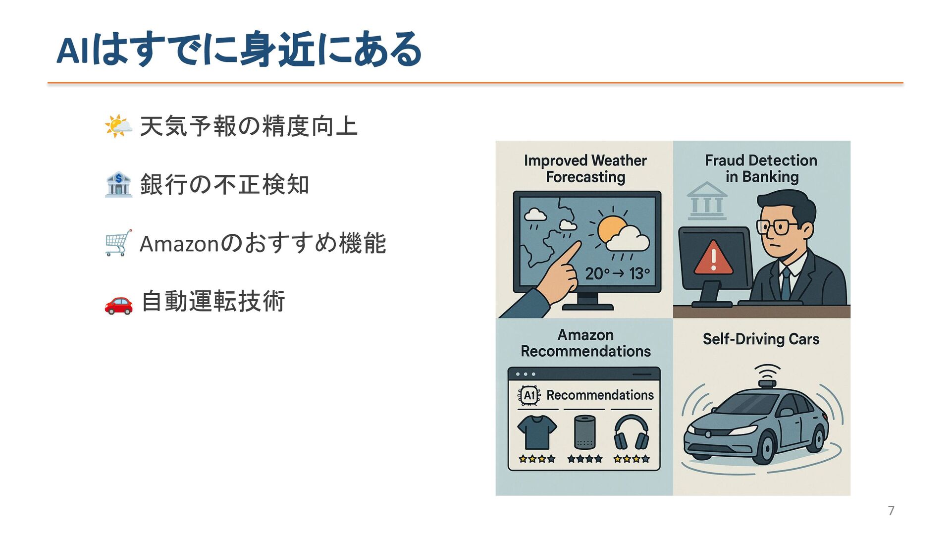 AIはすでに身近にある 🌤 天気予報の精度向上 🏦 銀行の不正検知 🛒 Amazonのおすすめ機能 🚗 自動運転技術 7