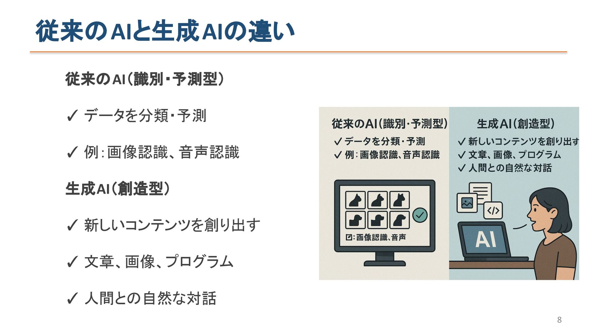 従来のAIと生成AIの違い 従来のAI(識別・予測型) ✓ データを分類・予測 ✓ 例:画像認識、音声認識 生成AI(創造型) ✓ 新しいコンテンツを創り出す ✓
