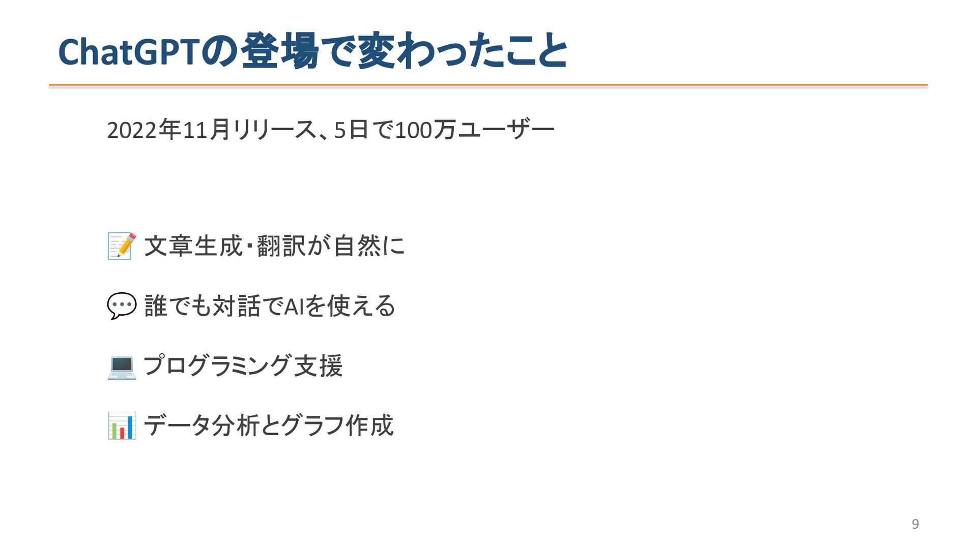 ChatGPTの登場で変わったこと 2022年11月リリース、5日で100万ユーザー 📝 文章生成・翻訳が自然に 💬 誰でも対話でAIを使える 💻 プログラミング支援 📊 データ分析とグラフ作成