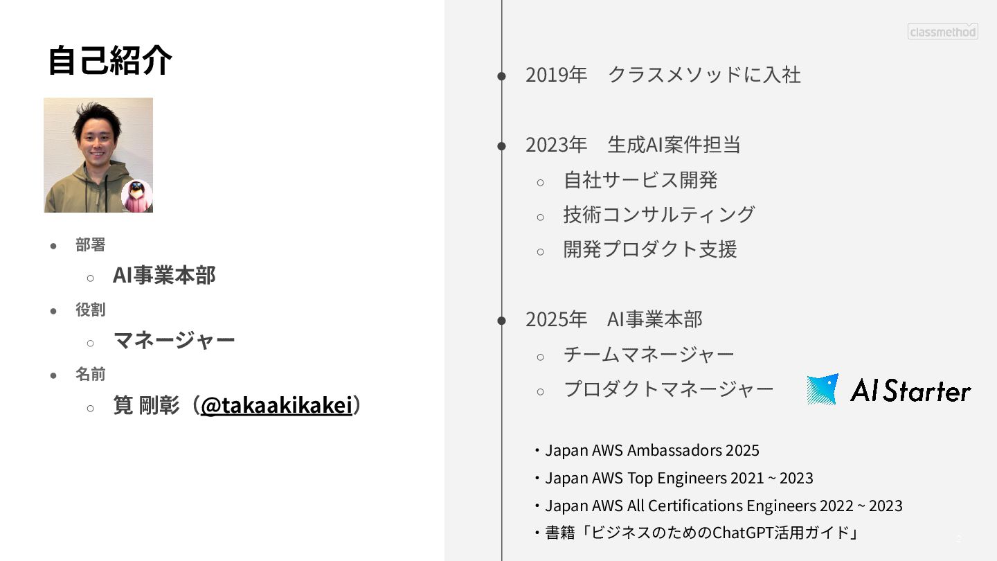 ◦ 開発プロダクト⽀援 • 2025年 AI事業本部 ◦ チームマネージャー ◦ プロダクトマネージャー • 部署 ◦ AI事業本部 • 役割 ◦ マネージャー • 名前 ◦ 筧 剛彰(@takaakikakei) ‧Japan AWS Ambassadors 2025 ‧Japan AWS Top Engineers 2021 ~ 2023 ‧Japan AWS All Certifications Engineers 2022 ~ 2023 ‧書籍「ビジネスのためのChatGPT活⽤ガイド」