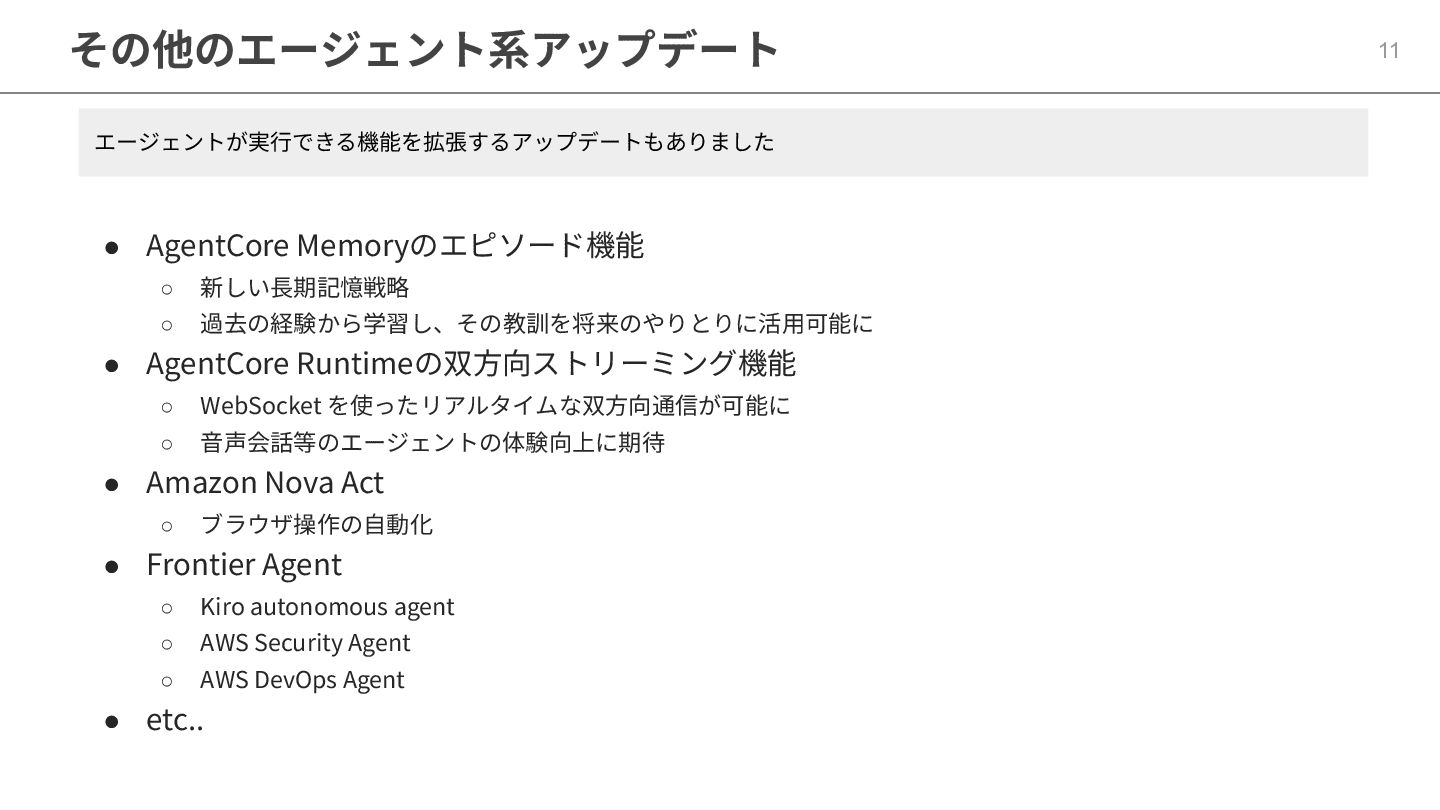 AgentCore Runtimeの双⽅向ストリーミング機能 ◦ WebSocket を使ったリアルタイムな双⽅向通信が可能に ◦ ⾳声会話等のエージェントの体験向上に期待 • Amazon Nova Act ◦ ブラウザ操作の⾃動化 • Frontier Agent ◦ Kiro autonomous agent ◦ AWS Security Agent ◦ AWS DevOps Agent • etc.. エージェントが実⾏できる機能を拡張するアップデートもありました