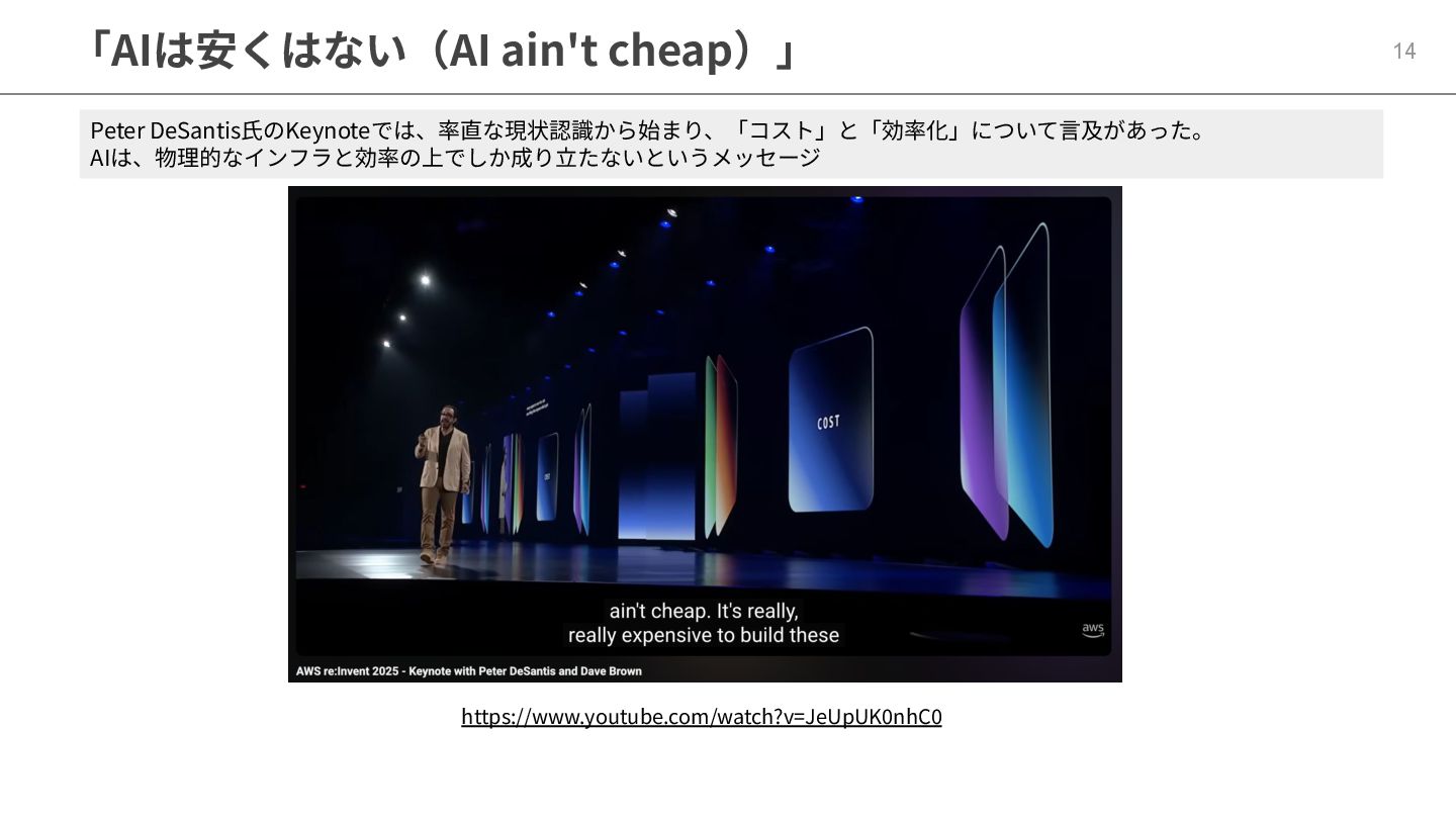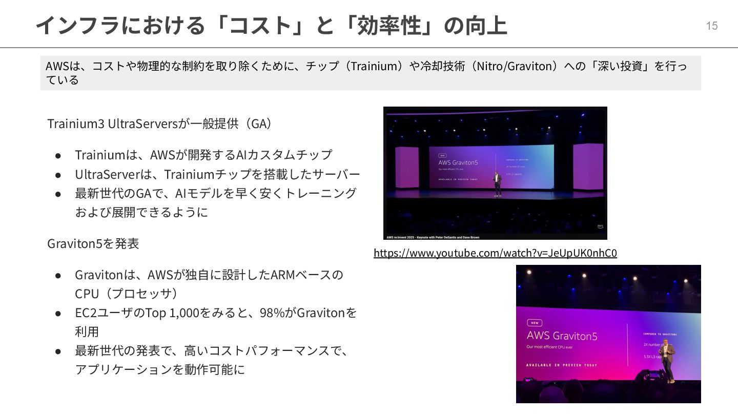 および展開できるように Graviton5を発表 • Gravitonは、AWSが独⾃に設計したARMベースの CPU(プロセッサ) • EC2ユーザのTop 1,000をみると、98%がGravitonを 利⽤ • 最新世代の発表で、⾼いコストパフォーマンスで、 アプリケーションを動作可能に AWSは、コストや物理的な制約を取り除くために、チップ(Trainium)や冷却技術(Nitro/Graviton)への「深い投資」を⾏っ ている https://www.youtube.com/watch?v=JeUpUK0nhC0