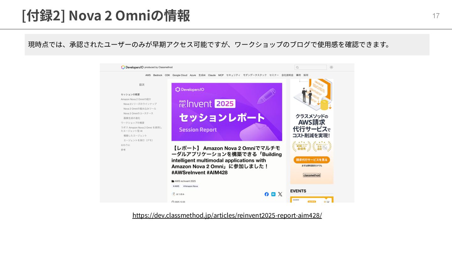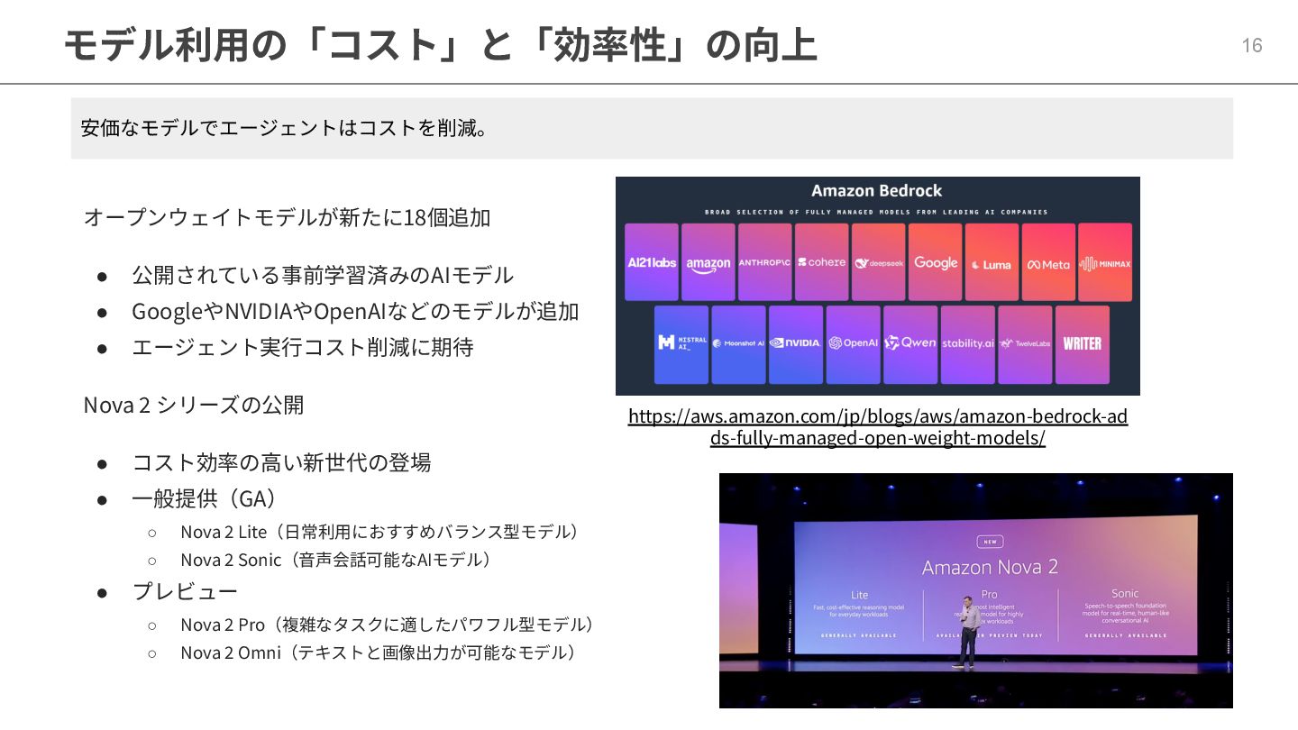 2 シリーズの公開 • コスト効率の⾼い新世代の登場 • ⼀般提供(GA) ◦ Nova 2 Lite(⽇常利⽤におすすめバランス型モデル) ◦ Nova 2 Sonic(⾳声会話可能なAIモデル) • プレビュー ◦ Nova 2 Pro(複雑なタスクに適したパワフル型モデル) ◦ Nova 2 Omni(テキストと画像出⼒が可能なモデル) 安価なモデルでエージェントはコストを削減。 https://aws.amazon.com/jp/blogs/aws/amazon-bedrock-ad ds-fully-managed-open-weight-models/