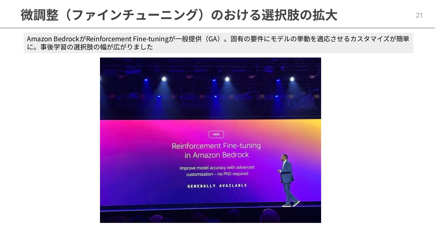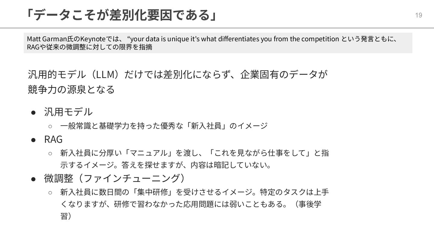 differentiates you from the competition という発⾔ともに、 RAGや従来の微調整に対しての限界を指摘 汎⽤的モデル(LLM)だけでは差別化にならず、企業固有のデータが 競争⼒の源泉となる • 汎⽤モデル ◦ ⼀般常識と基礎学⼒を持った優秀な「新⼊社員」のイメージ • RAG ◦ 新⼊社員に分厚い「マニュアル」を渡し、「これを⾒ながら仕事をして」と指 ⽰するイメージ。答えを探せますが、内容は暗記していない。 • 微調整(ファインチューニング) ◦ 新⼊社員に数⽇間の「集中研修」を受けさせるイメージ。特定のタスクは上⼿ くなりますが、研修で習わなかった応⽤問題には弱いこともある。(事後学 習)