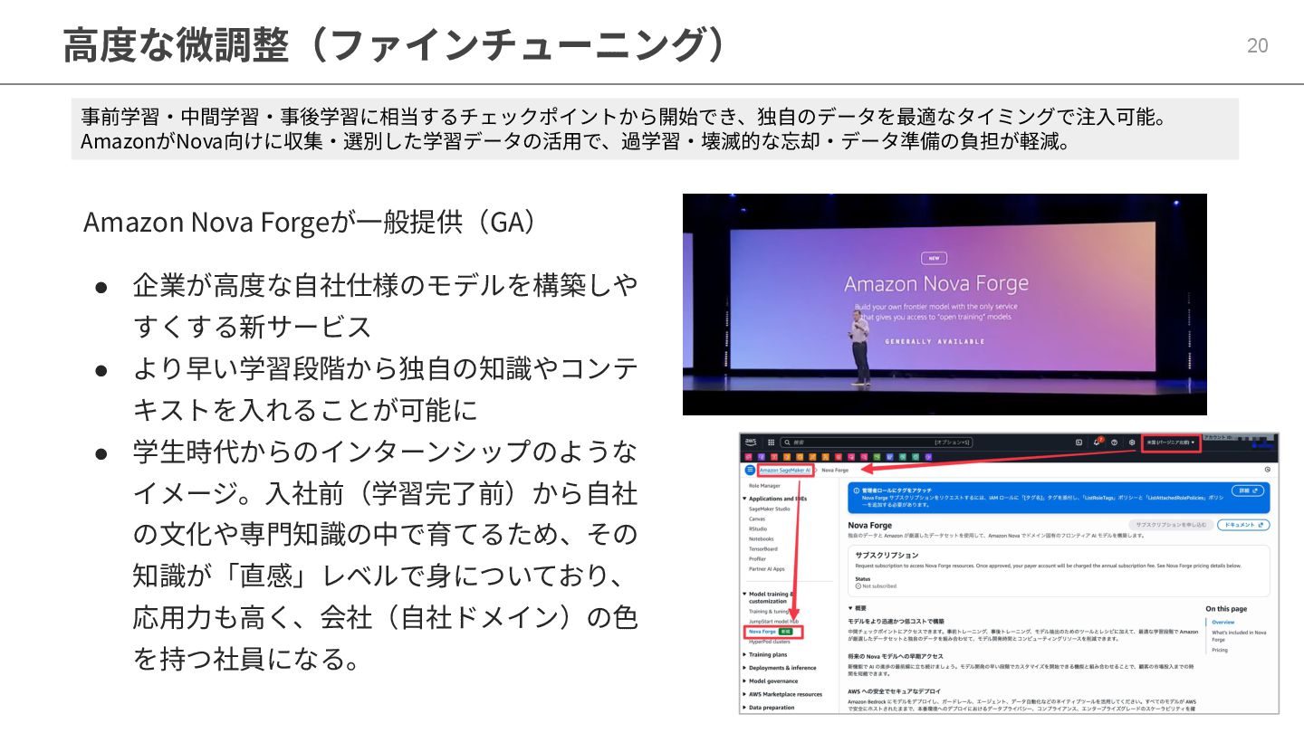 キストを⼊れることが可能に • 学⽣時代からのインターンシップのような イメージ。⼊社前(学習完了前)から⾃社 の⽂化や専⾨知識の中で育てるため、その 知識が「直感」レベルで⾝についており、 応⽤⼒も⾼く、会社(⾃社ドメイン)の⾊ を持つ社員になる。 事前学習‧中間学習‧事後学習に相当するチェックポイントから開始でき、独⾃のデータを最適なタイミングで注⼊可能。 AmazonがNova向けに収集‧選別した学習データの活⽤で、過学習‧壊滅的な忘却‧データ準備の負担が軽減。