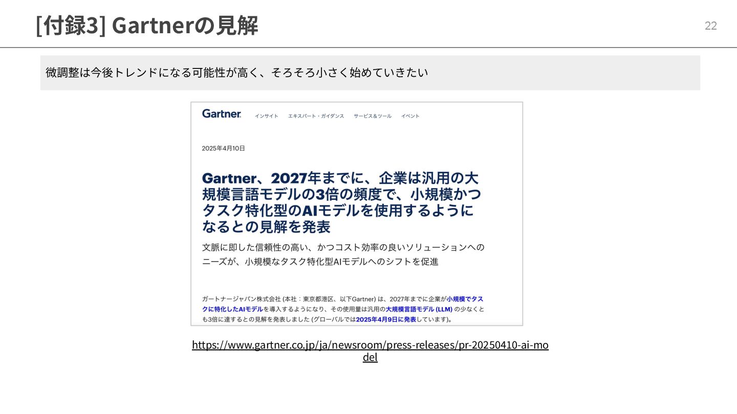 充実したインフラ‧モデル‧検索基盤を活⽤して、コスパよく構築。 3. データ活⽤ ◦ データこそが差別化要因。 ◦ RAGはコスト削減やマルチモーダル性の向上で、活⽤幅がさらに増加。 ◦ 微調整は今後トレンドになる可能性が⾼く、そろそろ⼩さく始めていきたい。